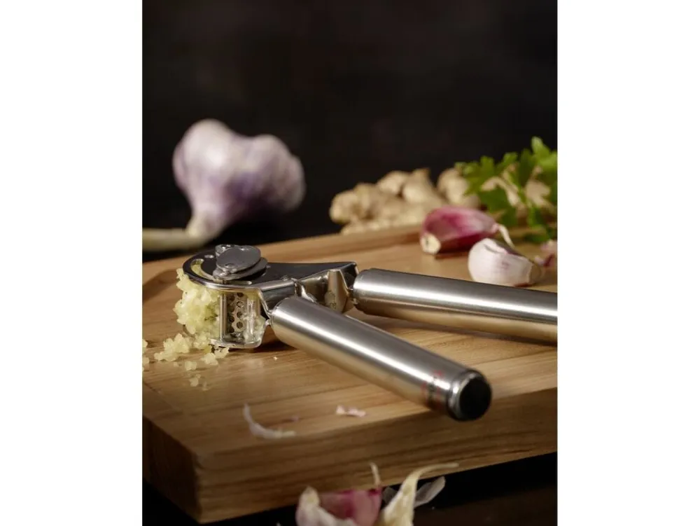 Hvidløgspresseren klarer selv hvidløg, der ikke er pillede. En særlig mekanisme sikrer, at hvidløgene presses nemt og effektivt med et minimum af kræfter. Hvidløgspresseren kan åbnes nemt helt op, når den skal rengøres under rindende vand. Tåler opvaskemaskine. (R12895)