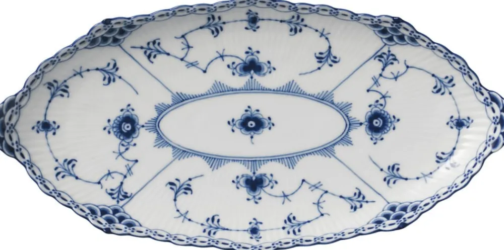 Godt 100 år efter, at det musselmalede var kommet til verden, blev mønstret smukt indrammeti blonder. Arnold Krog, som havde sans for detaljer, designede tillige de charmerende sneglehuse, der blandtandet pryder låg og hanke. Designet i 1888 af Arnold Krog.