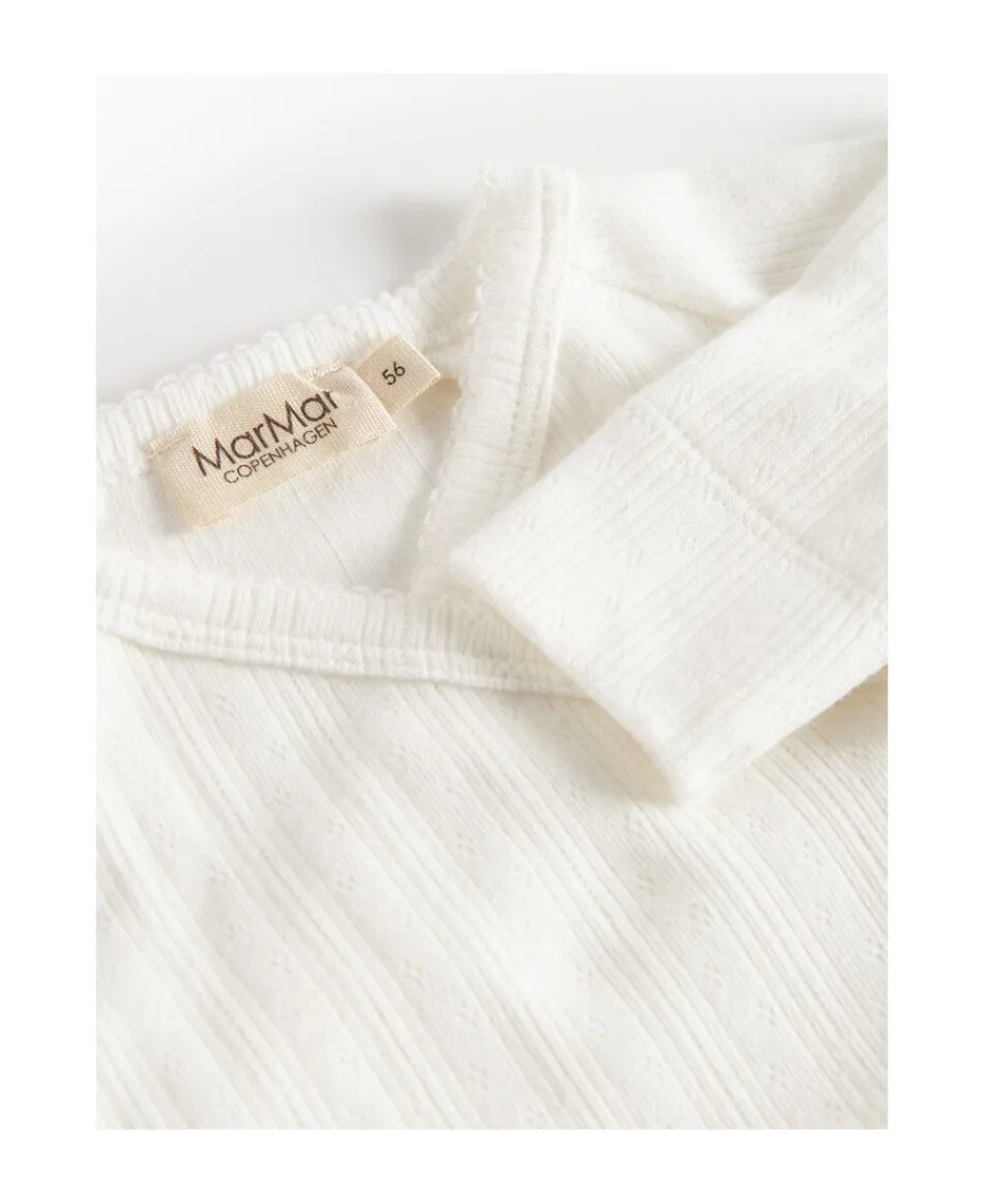 Langærmet pointelle heldragt med fødder til nyfødte. Heldragten har slå-om-lukning, picotkanter og lukkes med trykknapper og bindebånd fra halsen og ned langs det ene ben. Heldragten er blød, strækbar og behagelig at have på.