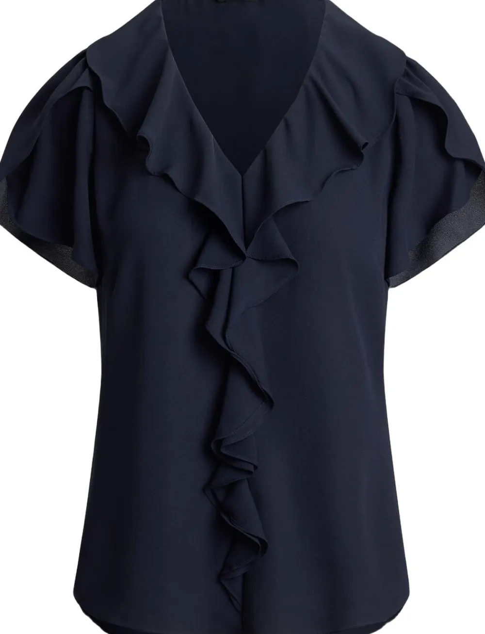 Denne bluse er ubestrideligt romantisk og forener luftig georgette med flæsekant og flagrende tulipanærmer
