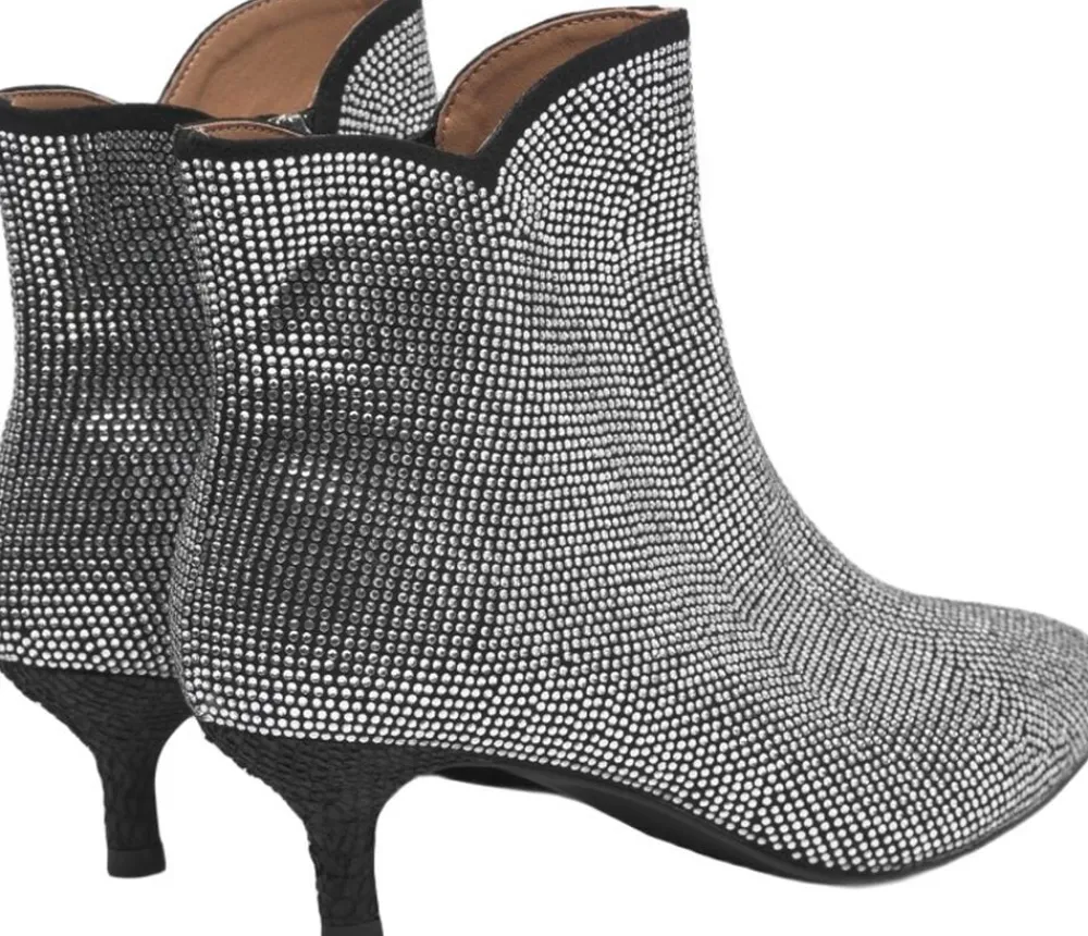 Glitrende glamour. Saga Zip Crystal er fremstillet af mikrofiber, udsmykket med blændende rhinsten, der fanger lyset i hver en krog og har en upcyclet fiskelæders detalje med ASC-certificering. WODENs Natural Soft Technology sikrer optimal komfort og støtte. – Overdel: 100 % mikrofiber med krystalsten – Ydersål: slidstærk tunit med Recycled – Hælhøjde: 5 cm – Skafthøjde: 12 cm – Skaftbredde: 12 cm – Detaljer i fiskelæder med ASC-certificering – WODEN Natural Soft Technology TM