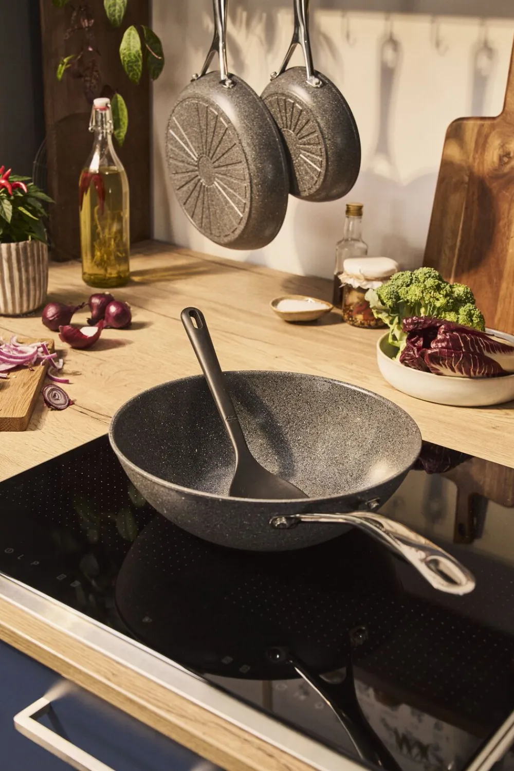 Mere robusthed for mere lethed. Med BALLARINI Salina Wok møder italiensk passion asiatiske aromaer. I den forbindelse kan man stole på en keramisk belægning af næste generation: CERAFORCE TITANIUM Udstyret med en ekstra robust basis af hård titanium er den op til fem gange mere holdbar end vores tidligere keramiske belægninger*. Samtidig giver den dig fremragende nonstick-egenskaber: Også med mindre fedtstof er det nemt at lave lækkerier. Især fordi den massive aluminiumskerne med innovativ Radiant-induktionsbund leder varmen særligt jævnt ud til kanterne af wokken. Det kølige håndtag i rustfrit stål med stay cool-funktion sikrer altid en behagelig og sikker håndtering. Molto bene!