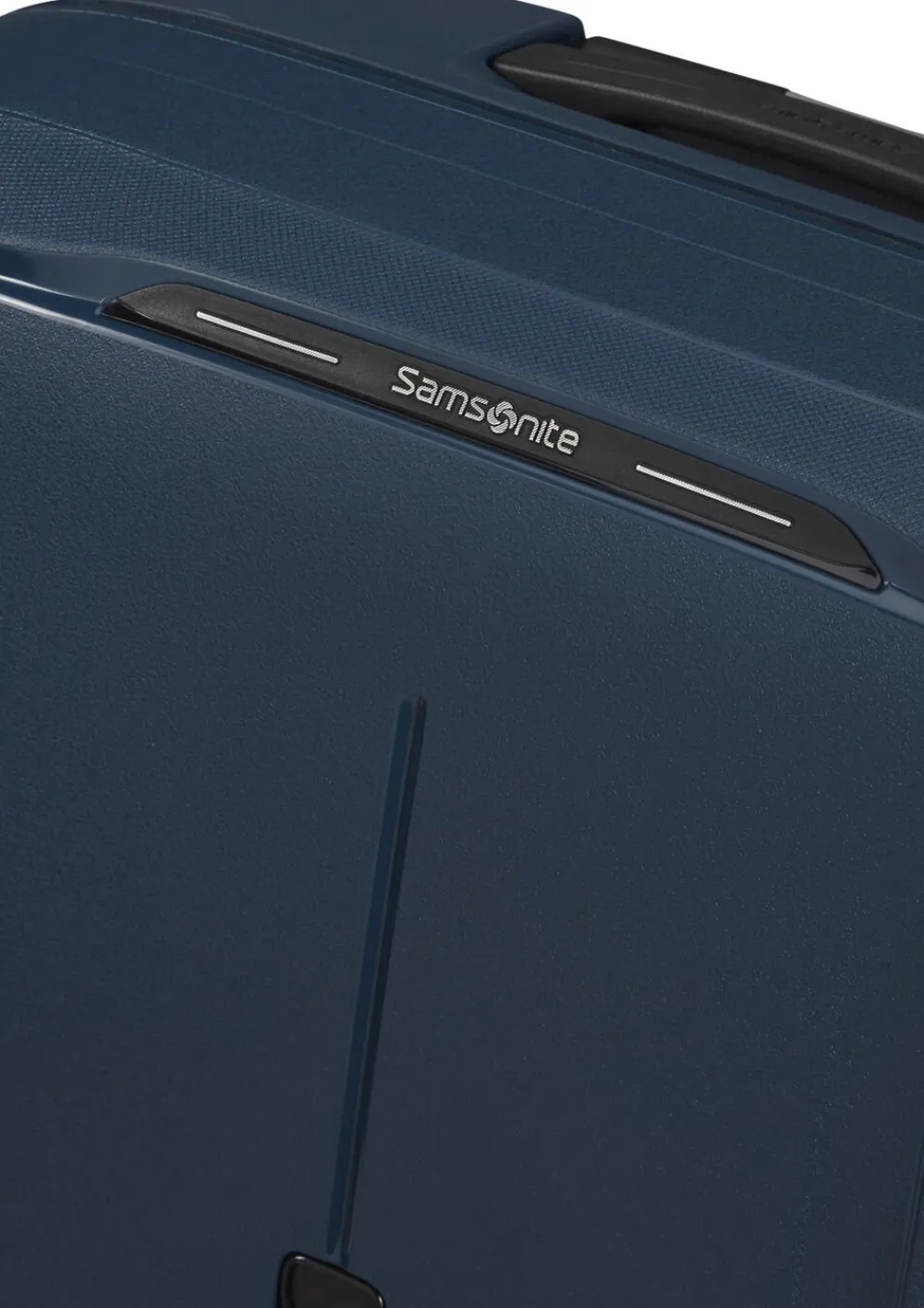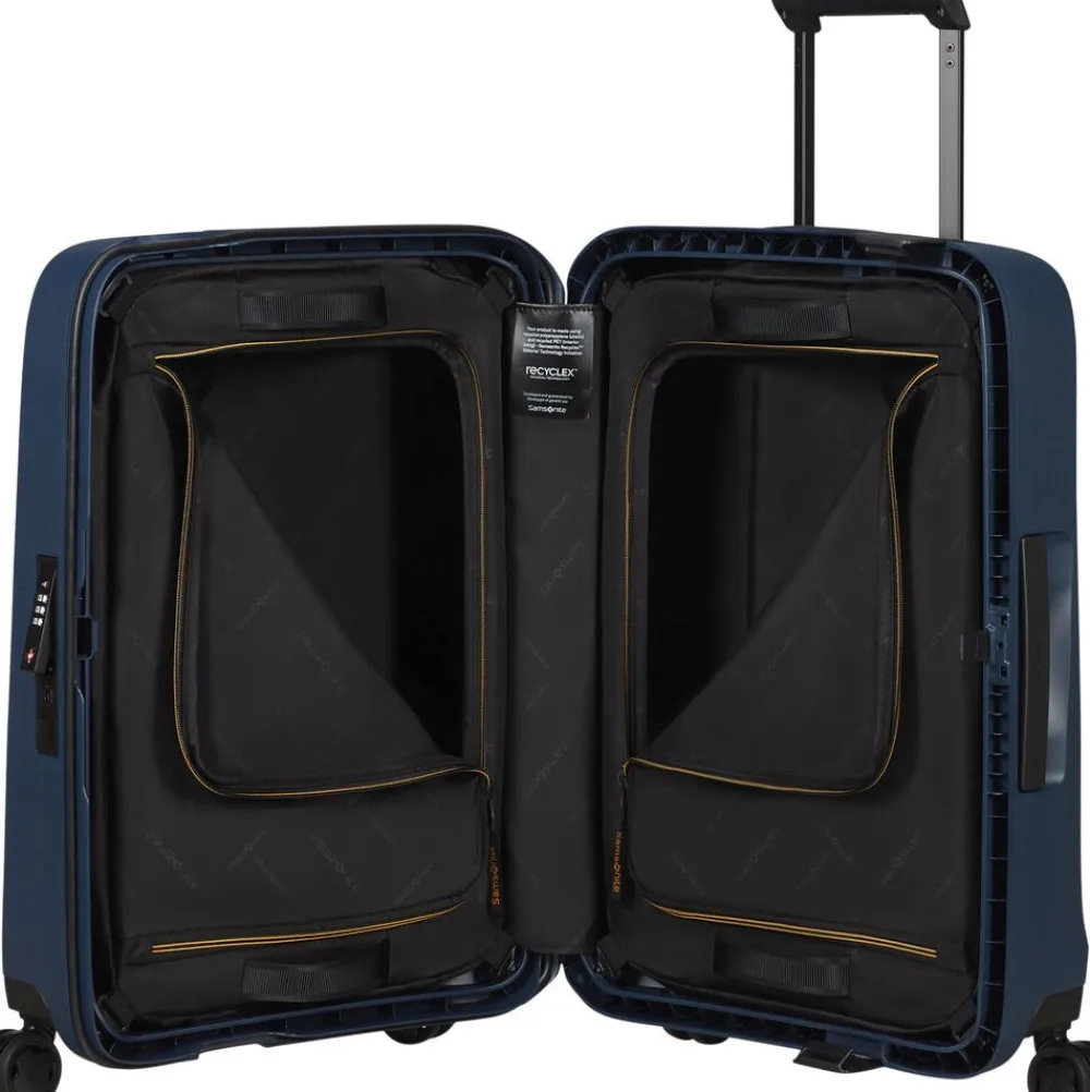 Kabinekuffert med 4 hjul, lavet af minimum 70% genbrugt polypropylen, stoffet indvendigt er lavet af genbrugte pet flasker,3 punkts TSA lås, dobbelt trollystativ, 2 aftagelige pakkeposer,2.6 kg,navneskilt,rumindhold 39 l, 5 års garanti