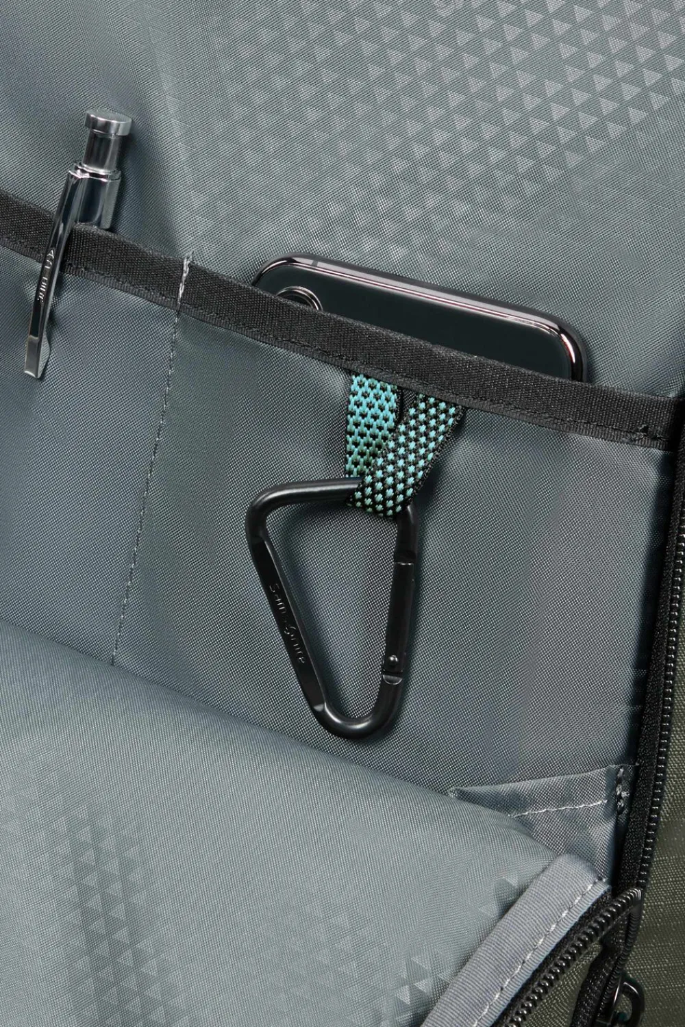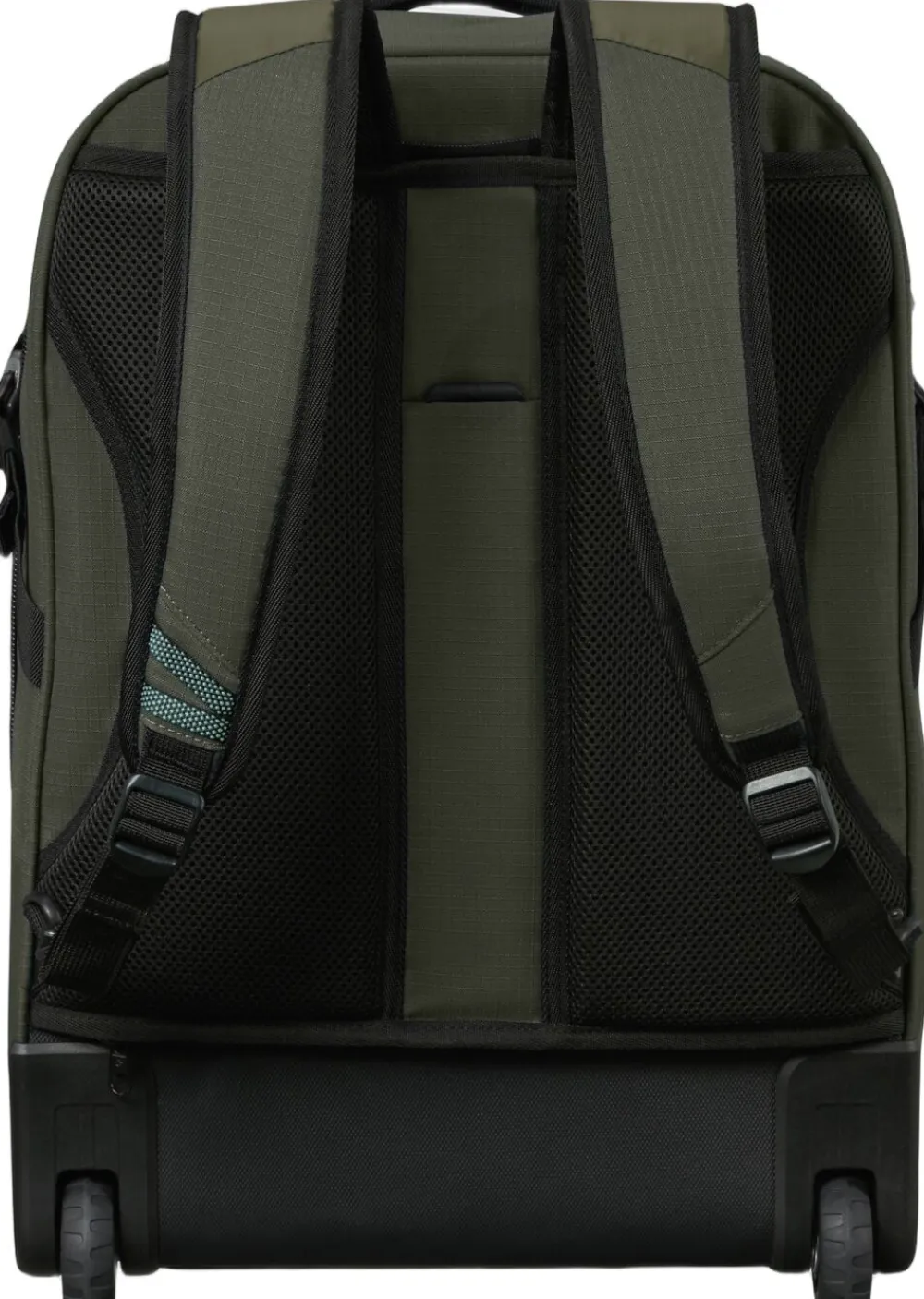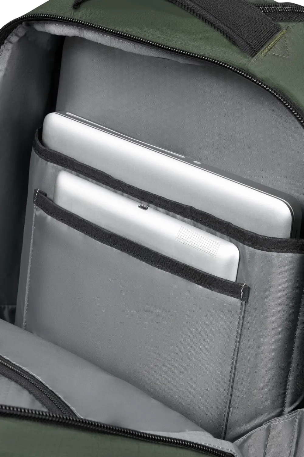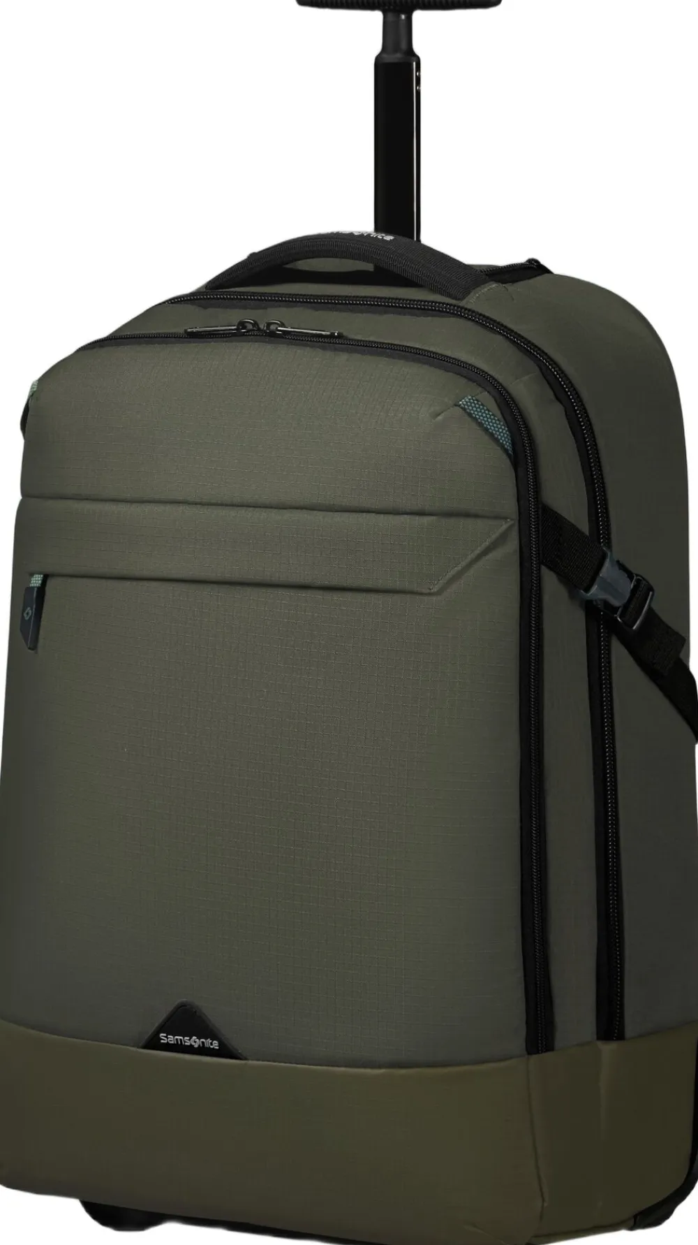 Computer rygsæk med hjul og plads til 17,3″ PC og 10,5″ tablet, både det indvendige og udvendige stof er lavet af genbrugsplast, frontlomme med lynlås, ergonomiske stropper, rumindhold 38 l, vægt 2,1 kg. 5 års garanti.