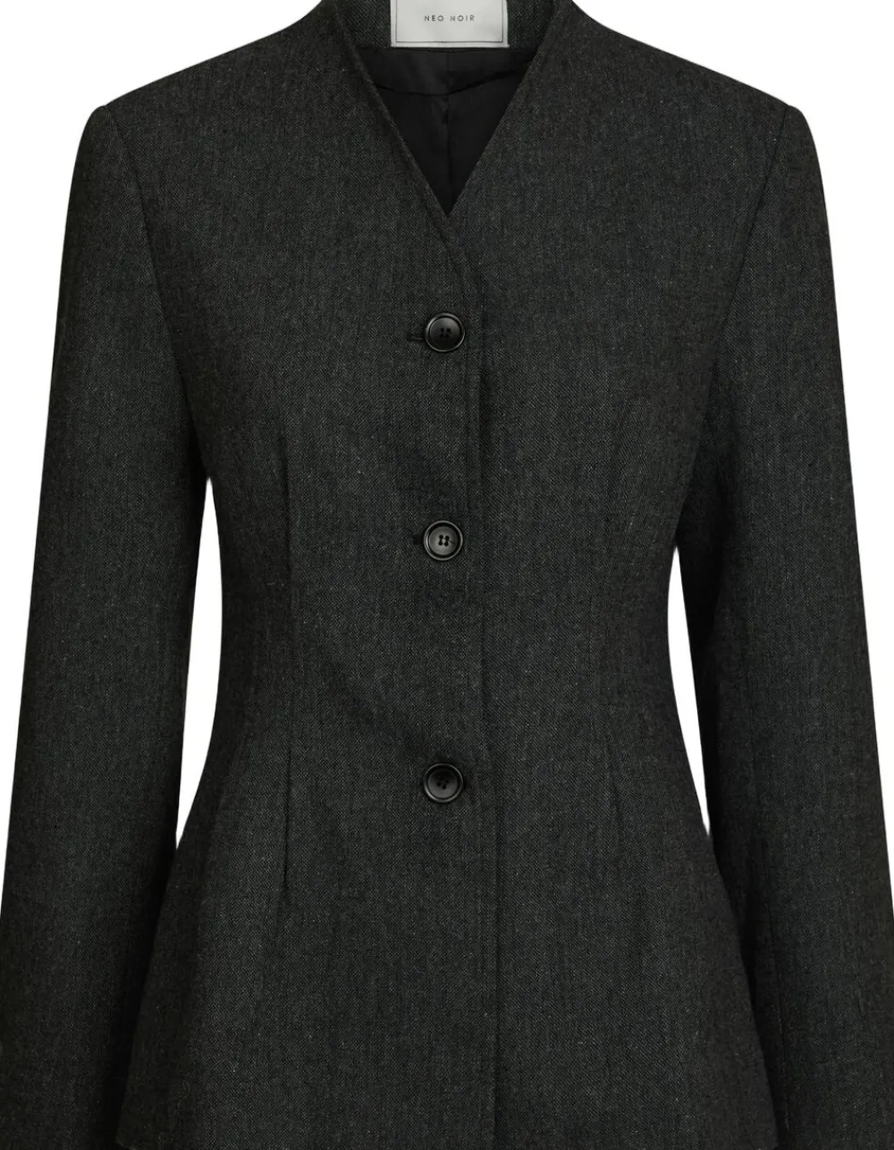 Figursyet blazer i en lækker vævet nistret kvalitet. Lukket med knapper foran og har en dekorativ halsudskæring og elegante ærmer. Modellen er 176 cm og bærer en størrelse 36
