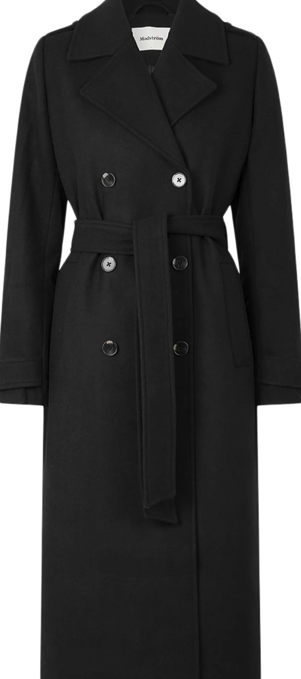 Klassisk, dobbeltradet uldfrakke med krave og revers. ShayMD coat har bredt taljebælte, skulderstropper, brede manchetter og stormflap. Med for og slids bagpå.