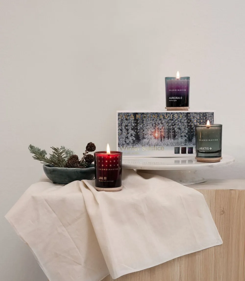 AURORA Duftnoter: Sandeltr? og eneb?r, jasmin og lime. JUL Duftnoter: Bagte honningkager, nelliker, krydret appelsiner og gl?gg. ARKTIS Duftnoter: Vindblåst tr?, Salvie fra den Arktis, Spearmint og snefnug. 3 duftlys af svensk rapsvoks med indgraveret b?getr?sl?g. AURORA, Magisk, undvigende, udefinerbar. Nordlysene er et af naturens syv vidundere, en symfoni af farver, bev?gelse og dimension, som gamle nordiske kr?nikeskrivere engang troede var soludbrud, store havbrande eller glacialt fluorescerende lys. SKOG – Svensk/Norsk for skov. Skove dækker mere end halvdelen af de Skandinaviske lande og strækker sig fra den sydligste del af Sverige op til den arktiske cirkel. ARKTIS – Norwegian/Danish for Arctic. Det frosne og vidtstrakte landskab forenet gennem, Norge, Sverige og Finland er lige dele friskt og betagende som det er afsides og fjendtligt. En blanding af mere end fem ?teriske olier.