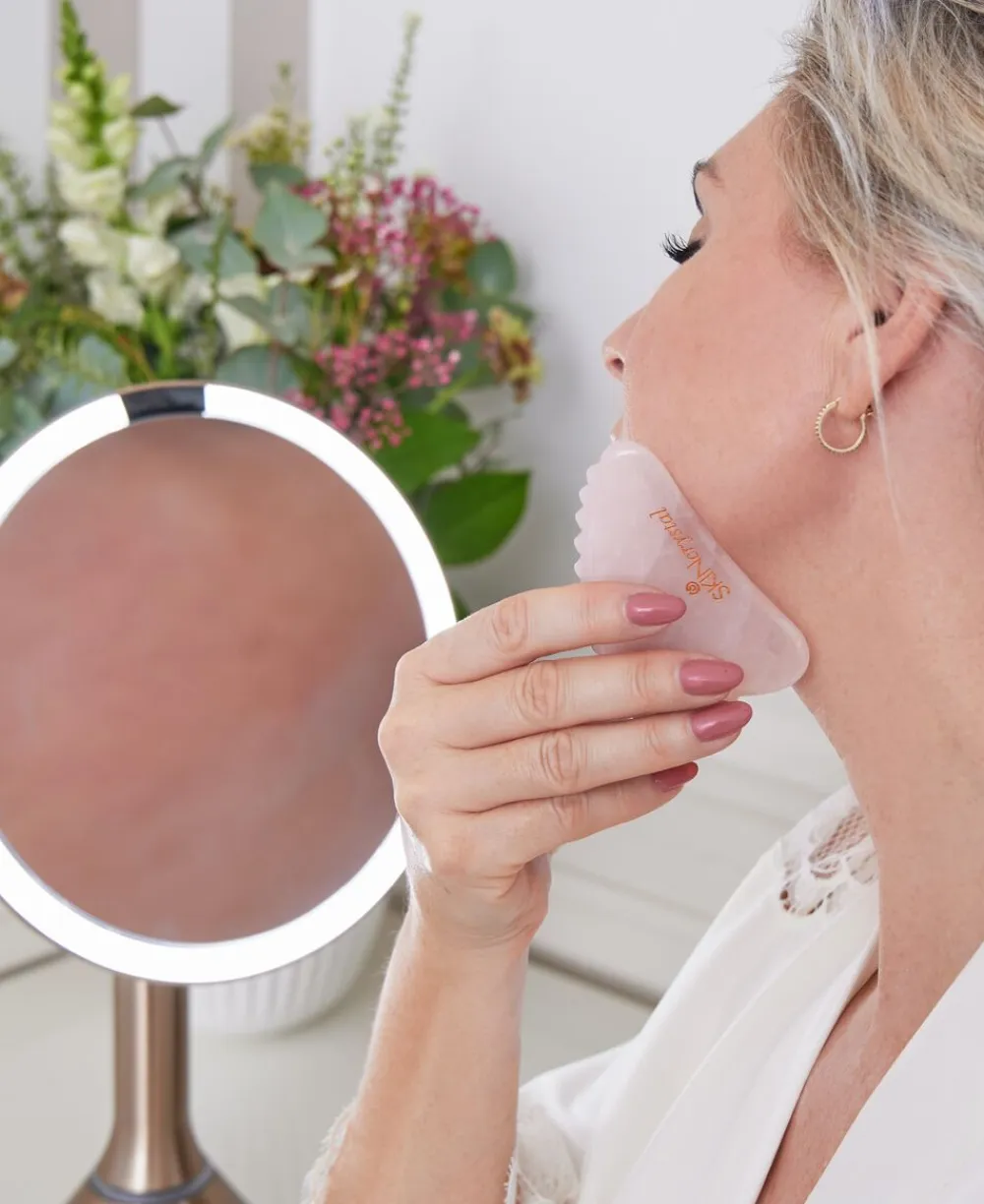 Rosenkvarts alt-i-et massagesæt med rosaguld skaft og 3 udskiftelige hoveder til forskellige slags ansigtsmassage, samt en lækker Gua Sha sten til de blide strøg, drænage og bindevævsmassage – Rosenkvarts symboliserer ro og harmoni.