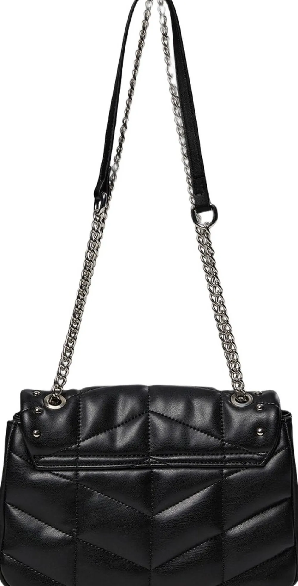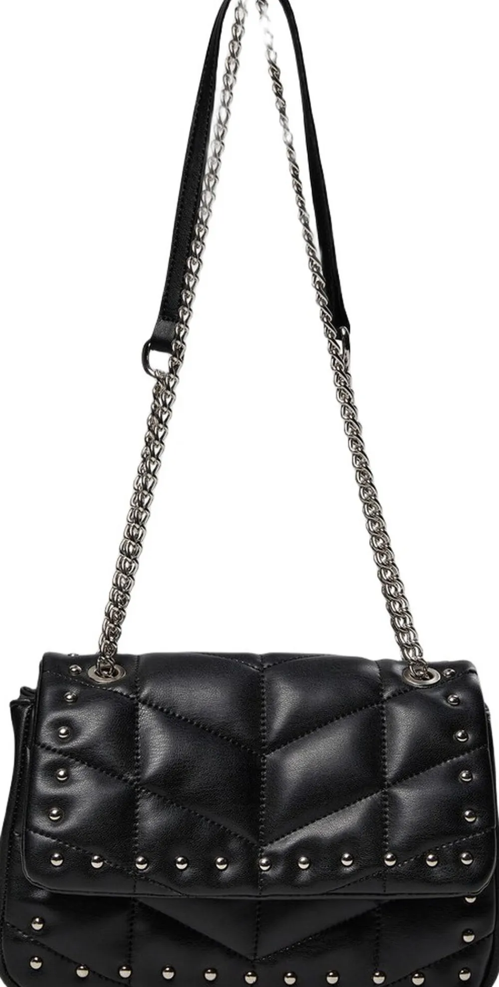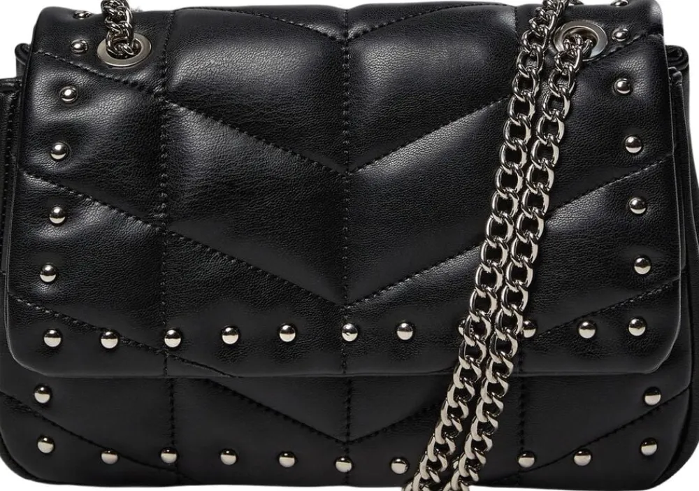 Sort taske Synlige sømme i et geometrisk mønster Dekorative metalnitter foran og nederst Sølvfarvet kæderem Kæderem fastgjort med metalringe øverst på posen Flap-cover med synlig kant og stud-detalje nederst Rektangulær form med let afrundede hjørner