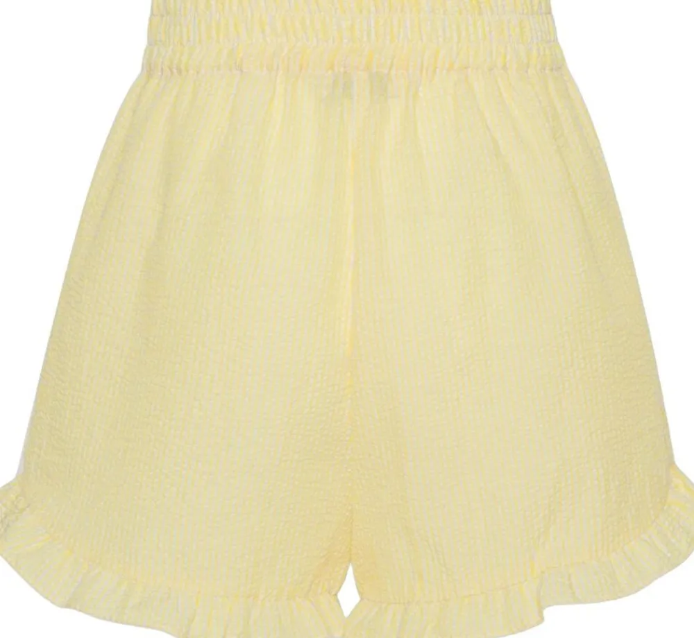 Sonja shorts er et par korte, Løs shorts i et stribet crepemateriale. De har elastik i taljen og en diskret flæsedetalje nederst. Shortsene er normale i størrelse – Kort – Elastisk bånd – Frill-detalje