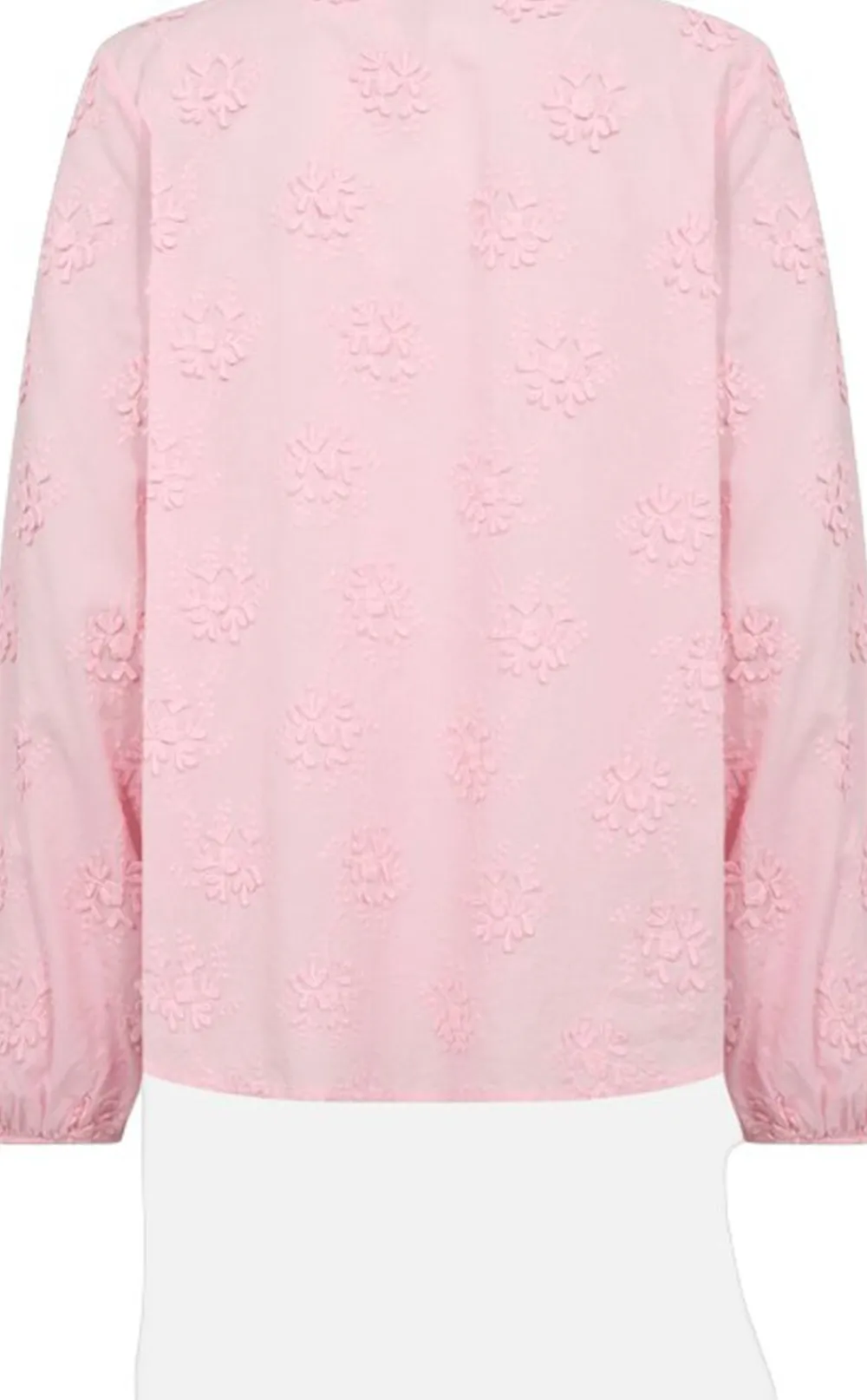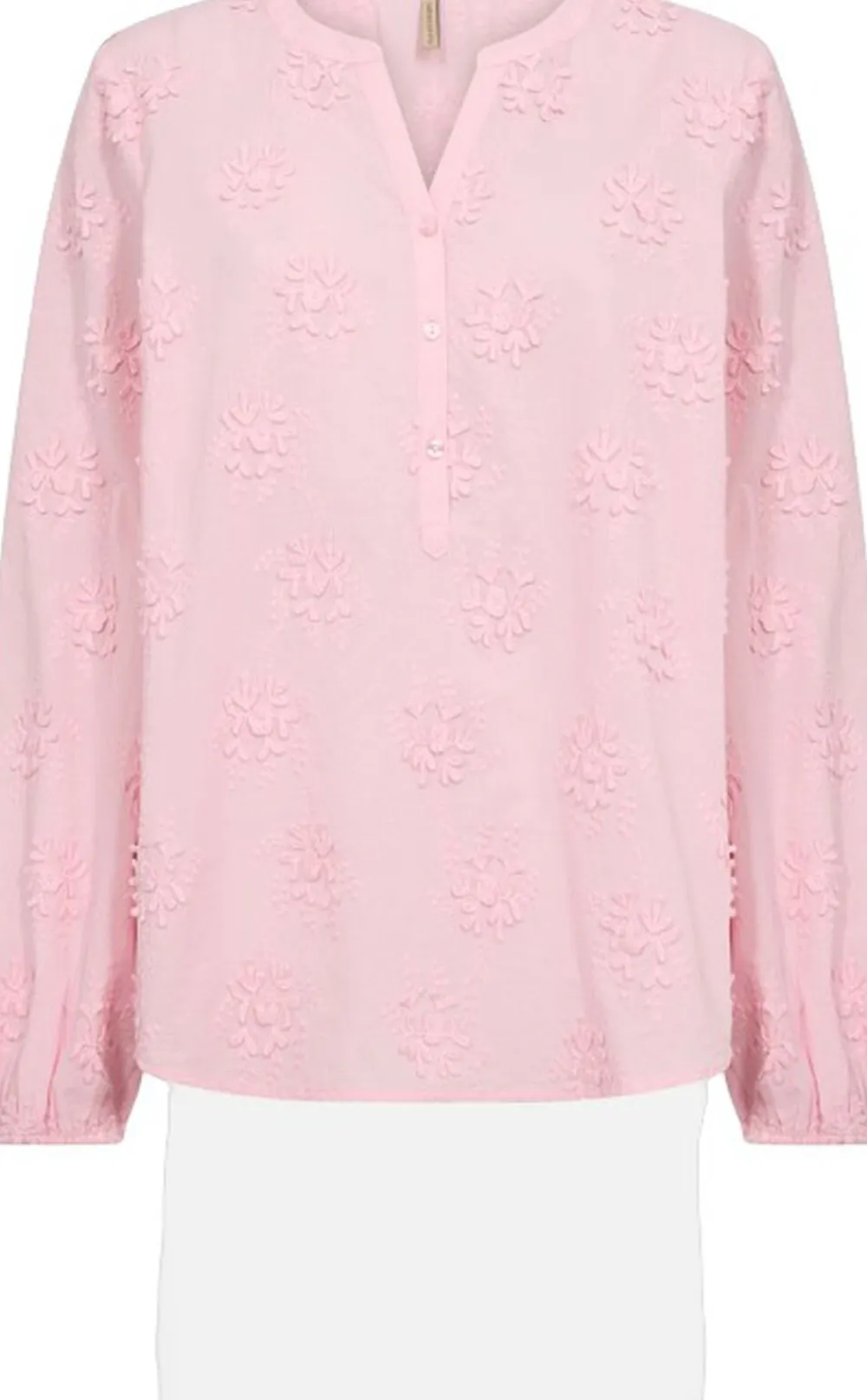 SC-BARBRA 1 er en bluse fremstillet af 100 % økologisk bomuld. Den har en diskret v-udskæring, delvis knapstolpe og blomsterbroderi, som giver en unik tekstur. Sæt den sammen med skræddersyede bukser eller en klassisk nederdel for et elegant look.