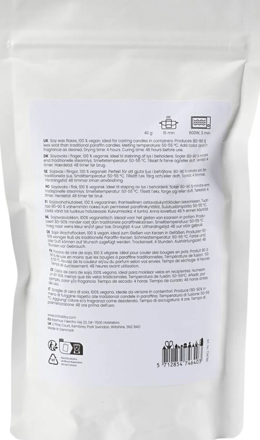 Soyavoks i flager, 100 % vegansk. Perfekt til dig, der vil støbe dine egne lys i beholdere. Soder 80-90 % mindre end traditionelle stearinlys. Smeltetemperatur: 50-55 °C. Tilsæt fx farve og/eller duft. Tørretid: 4 timer. Hærdetid: 48 timer før brug. Med vores sojavoks kan du nemt støbe smukke sojalys i beholdere. Sojavoks brænder helt rent, og soder derfor meget mindre end traditionelle stearinlys. Da voksen kommer i flager, kan du meget nemt doserer den nøjagtige mængde, når du støber. Har du lyst, kan du også tilsætte farve og duft i dine lys. Smelt først voksen i et vandbad (gryde med vand på kogeplade) eller i en mikrobølgeovn ved 80 % styrke med 30 sekunders interval. Bland herefter duft og farve i, og sæt en væge fast i beholderens bund med lidt lim eller flydende voks. Hæld til sidst den smeltede blanding i.