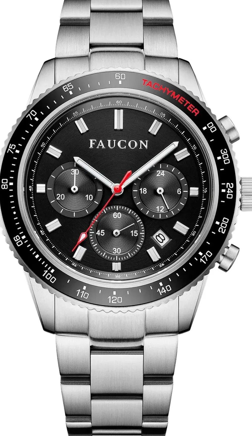 Faucon Speedtimer F10013 er et imponerende ur, der kombinerer sporty elementer med praktiske funktioner. Uret har en rund urkasse med en diameter på 43 mm, hvilket skaber en markant tilstedeværelse på håndleddet. Den sorte urskive er suppleret med tre kronografer, der tilføjer et dynamisk touch til designet. Tachymeter-skalaen på bezelen forstærker dets sporty udseende, mens de lysende visere sikrer læsbarhed i svagt lys. Dette kronografur er udstyret med en datovisning, hvilket gør det både stilfuldt og funktionelt.