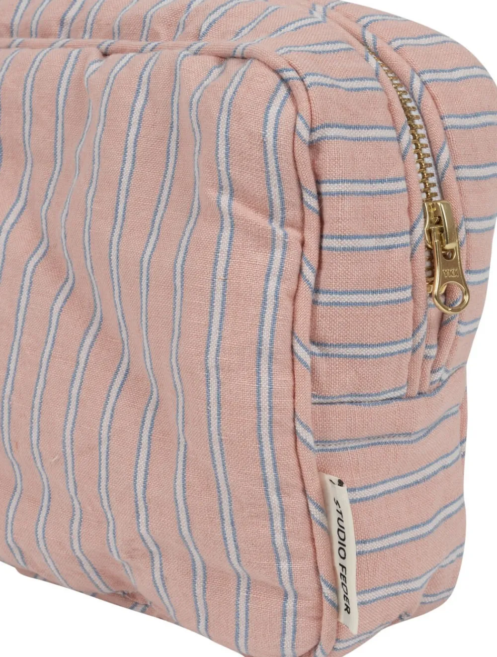 OCS (Organic Content Standard) certificeret toilettaske i en vasket hør- og bomuldsblanding. Vasken gør stoffet blødt og giver toilettasken et smukt, underspillet udtryk. Fyldet i toilettasken er 100% genanvendt polyester. Lukkes med en kraftig lynlås i messing. Mål 23x16x5 cm.