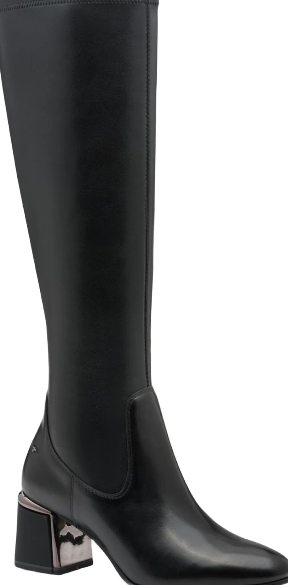 Langskaftet strechstøvle med sølvdetalje på hælen. Indvendig lynlås og antislide og antichok effekt i hælen. Skafthøjden er 40 cm og hælhøjden er 60 mm