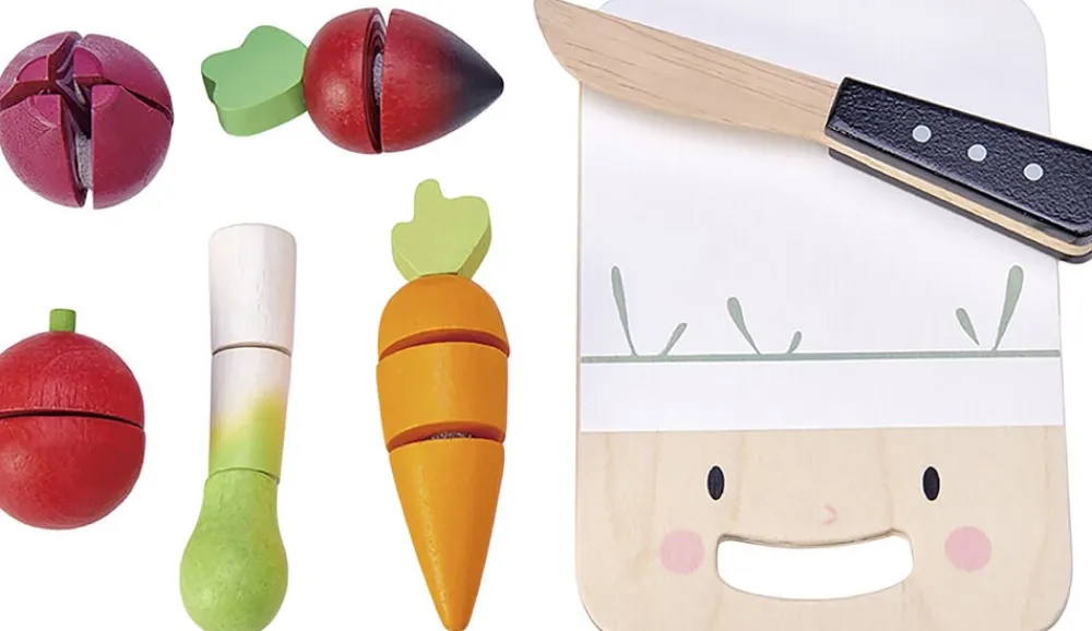 Skærebræt med trækniv og grøntsager, der kan skæres over og sættes sammen igen ved hjælp af velcro.