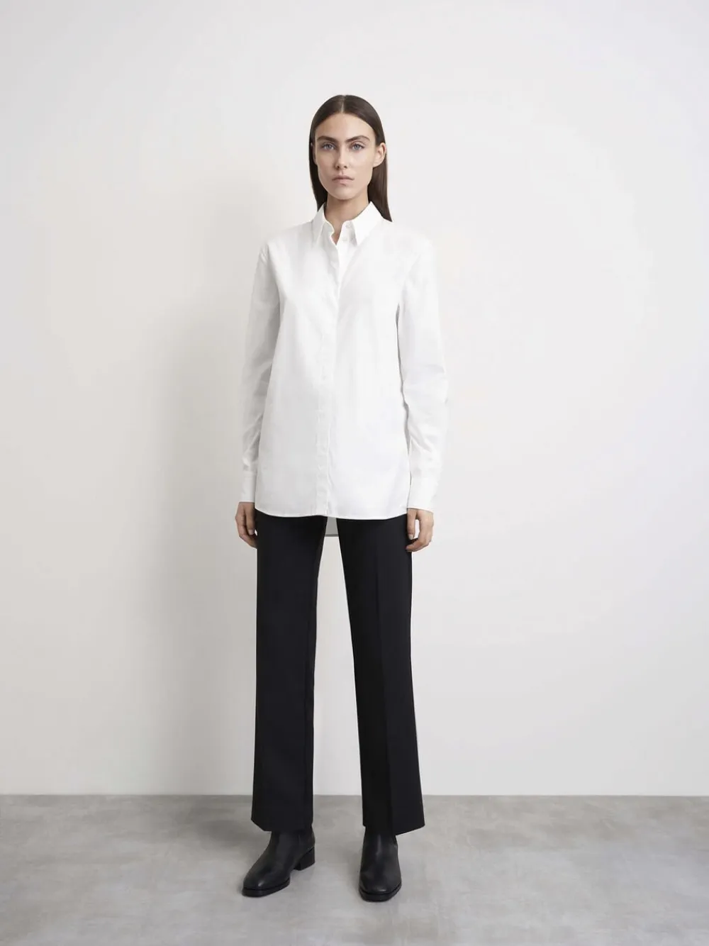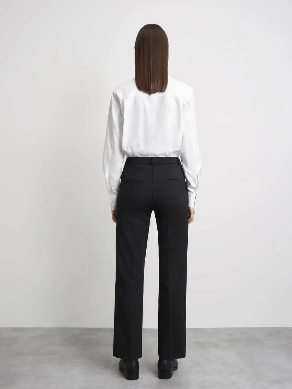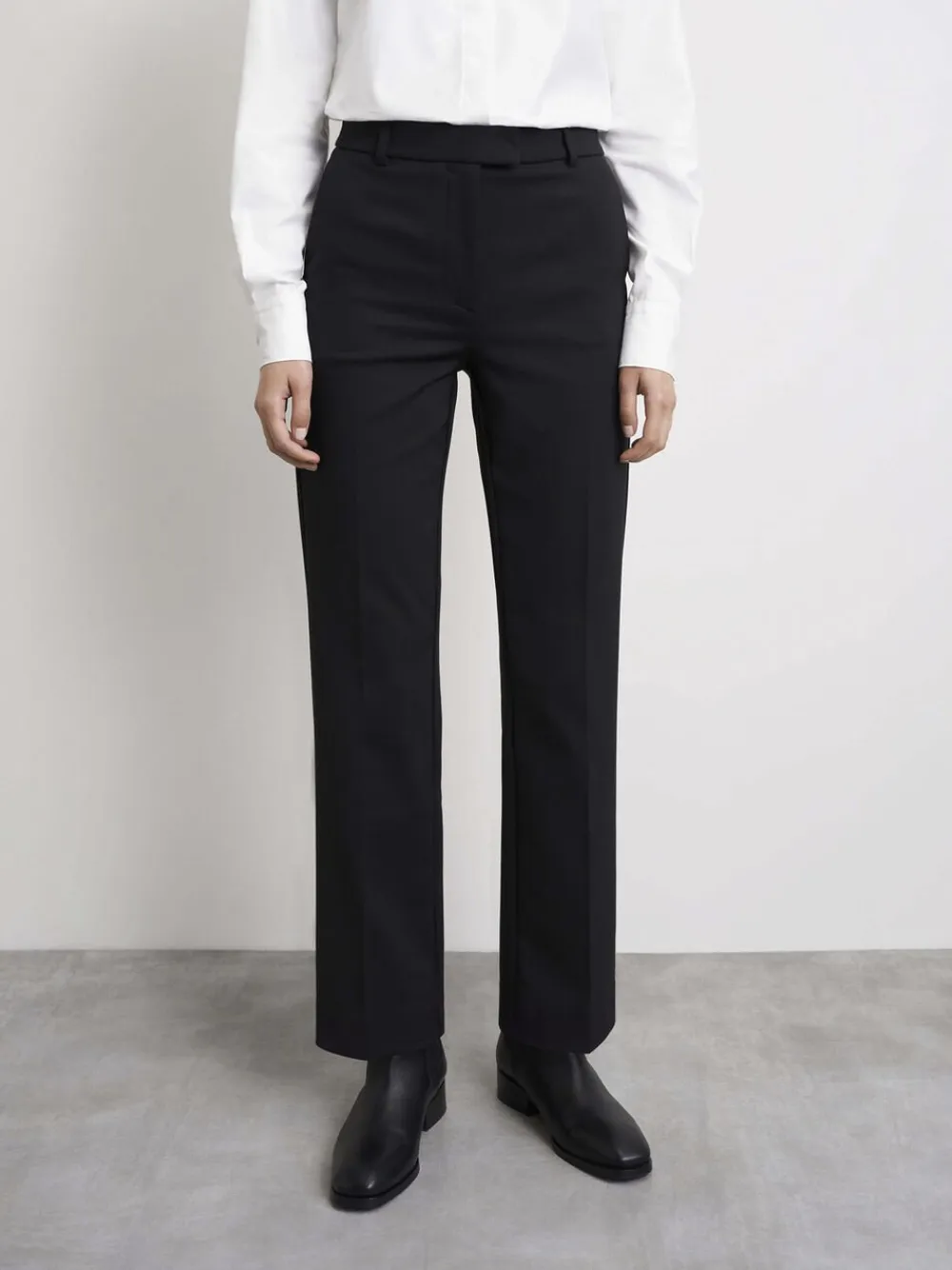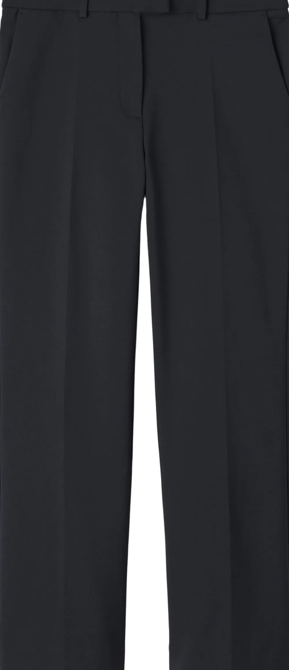 Bukser i en blanding af bomuldsstræk. Slank pasform med lige ben og stumpet længde. Mellemhøj talje med skrå lommer foran og kantede lommer bagpå. Fremstillet i Rumænien