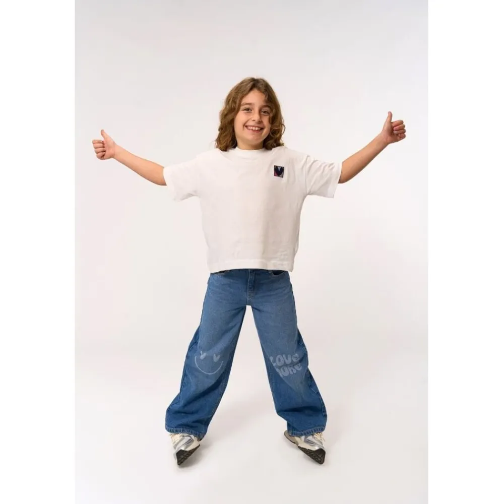 Stilfulde pigebukser med vidde i benene og et glad ansigt på det ene ben samt teksten “Love more” på det andet. I en klassisk mellemblå denimfarve og med det søde print, har bukserne masser af charme og stil. Brug disse fine og charmerende jeans fra THE NEW som en del af et afslappet hverdagsoutfit, eller kombiner dem med en flot top til fester og særlige lejligheder. – Løs pasform med brede ben (wide-leg). – Print på benene. – Justerbar elastik i taljen, så omkredsen kan tilpasses efter behov. – Funktionelle lommer foran og bagpå. – Bæltestropper.