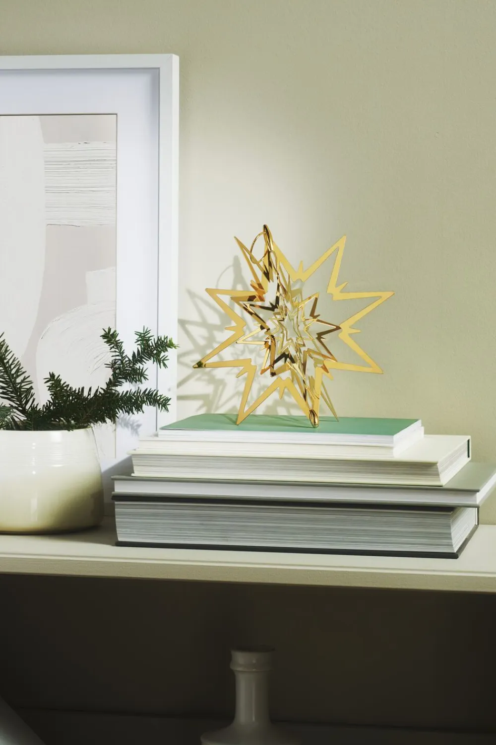 Den forgyldte juletræsstjerne er en klassisk favorit blandt Georg Jensens mange elskede produkter.Få juledekorationer er lige så ikoniske som denne stjerne, der stråler højt fra træets grønne top i mange hjem. Som kronen på værket er topstjernen den ultimative decemberpynt, der favner alt det, der handler om familiehygge og julestemning i den kolde tid.Juletræsstjernens spiral sikrer, at den kan sættes fast på alle slags træer, men den kommer også med et smukt rødt silkebånd, hvis du skulle foretrække at hænge den fra en af grenene sammen med den anden julestads.Topstjernen kommer med et spiralvedhæng, som gør det let at fæstne juletræsstjernen til toppen af træet. Hvis du foretrækker at hænge stjernen som et julehjerte eller et kræmmerhus fra et af træets grene, kan du sagtens gøre det ved hjælp af det røde silkebånd, der følger med.