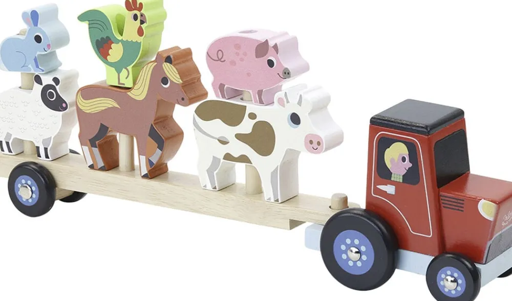 Traktor og anhænger med dyr, der kan stables: Kanin, lam, hest, hane, gris og ko.