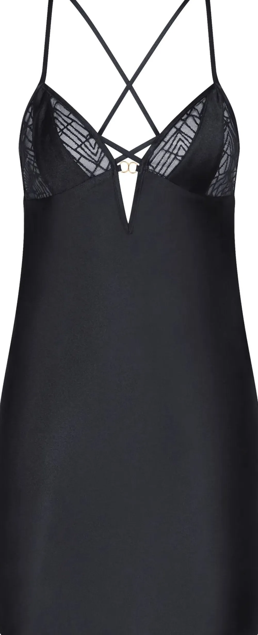 Denne tiltrækkende underkjole med dyb krydsryg lover uforglemmelige øjeblikke. Slyngede geometriske blondeelementer og glitrende metal giver et strejf af luksus. Denne GRS-certificerede underkjole er fremstillet af skinnende satin, der består af 90 % genanvendt nylon, og falder smukt på kroppen.