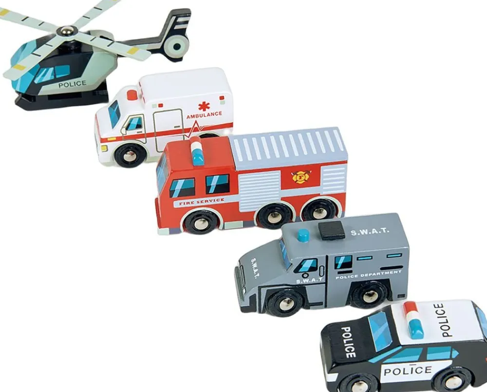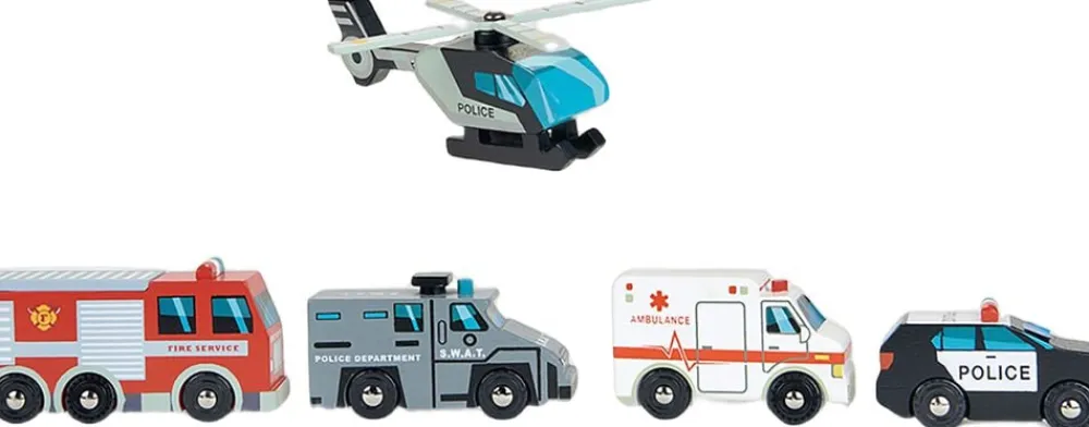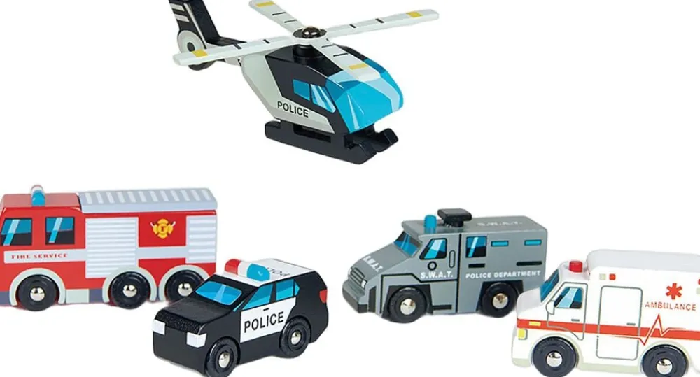 Indhold: Helikopter med roterende vinger, ambulance, brandbil, politibil og indsatsvogn.
