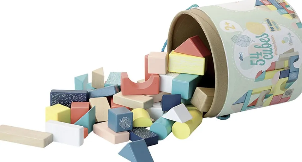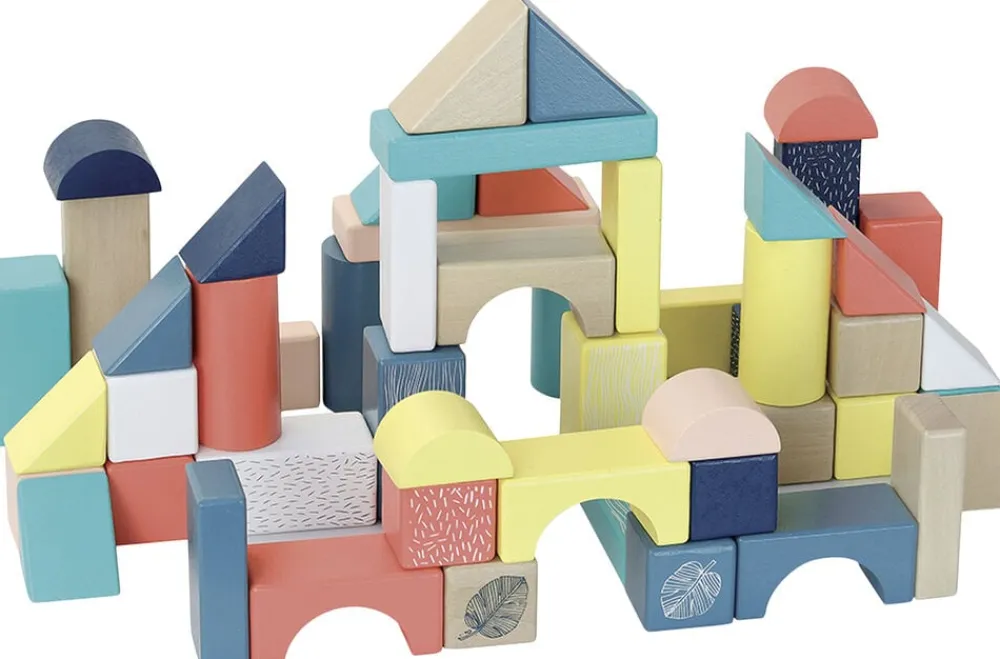54 byggeklodser af træ, malet i naturlige douce farver.
