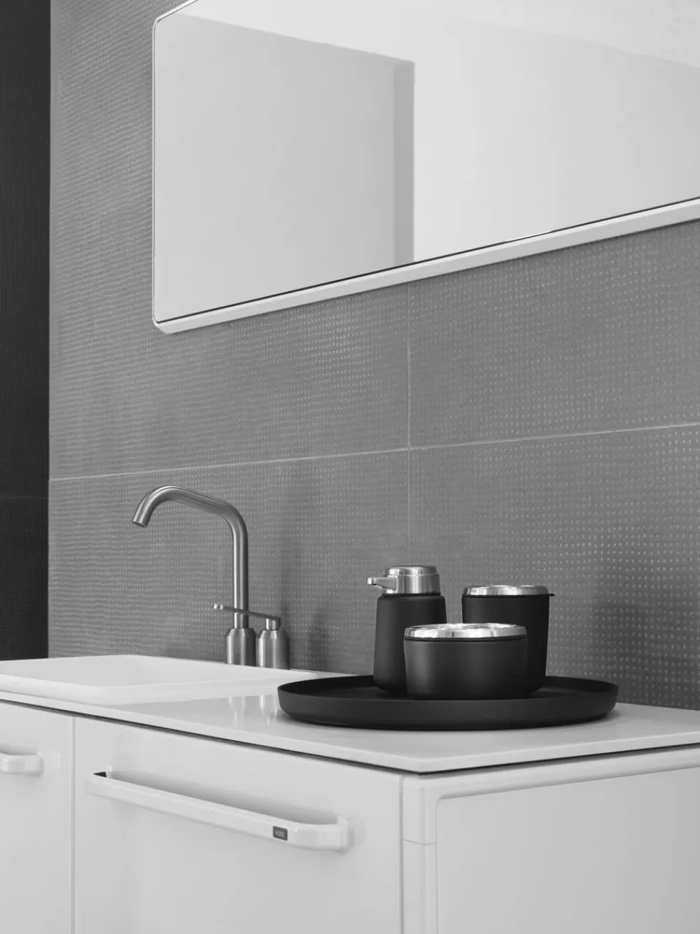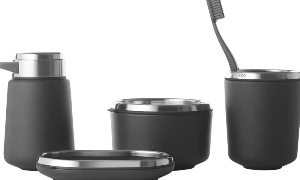 Vipp tandbørstekruset er designet med en todelt gummiindsats og en skridsikker gummibund, der beskytter overflader. Alle gummidele kan rengøres i opvaskemaskinen. Materialevalg og formsprog matcher både sæbeskålen og sæbedispenseren og understreger det tydelige slægtskab på tværs af Vipp kollektionen. En af de vigtigste funktionaliteter ved designet af tandbørstekruset er, at man kan skille de enkelte elementer fra hinanden for praktisk og ordentlig rengøring. Samtidig vidner komponenternes indbyrdes pasning om et produkt, der er udført i gedigne kvalitetsmaterialer med lang levetid’ – Morten Bo Jensen, chefdesigner.