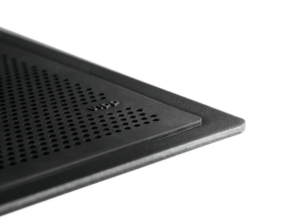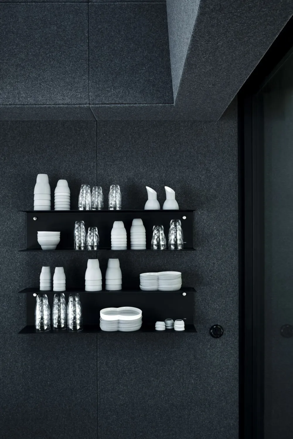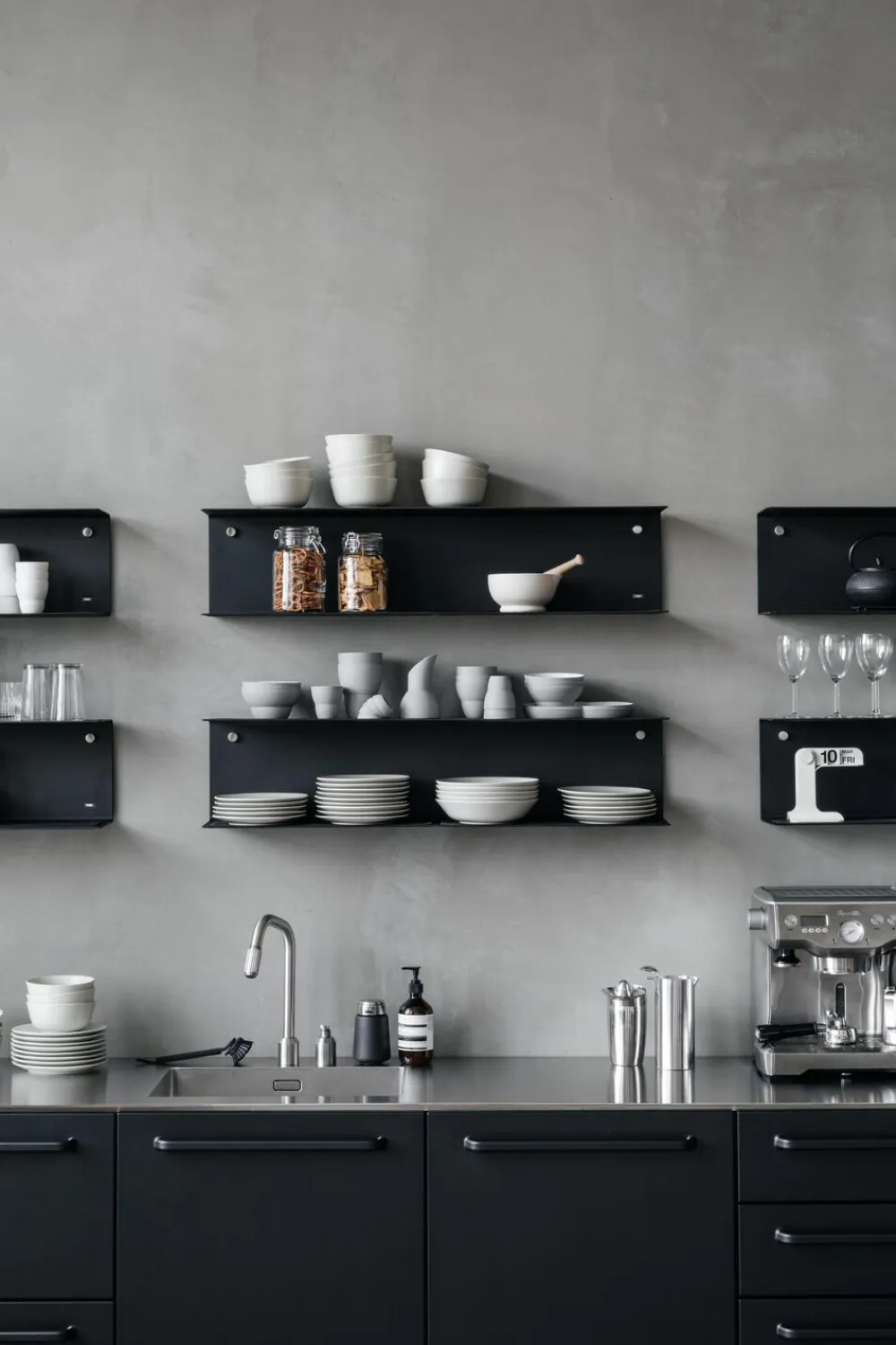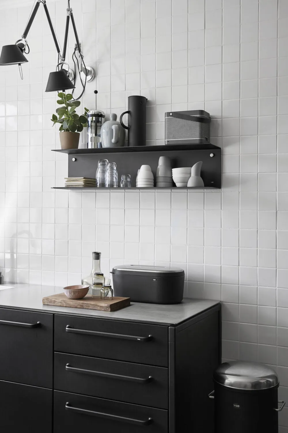Denne Vipp922 hylde er en funktionel opbevaringsløsning til badeværelset, køkkenet, soveværelset eller kontoret. Hylden monteres med et usynligt beslag. De CNC-fræsede fingerskruer er specialdesignet af Vipp i børstet rustfrit stål, og udgør både en subtil detalje i hyldens funktion og design. En fordybning i hyldens nederste flade er udstyret med en silikonemåtte for at skåne glas og porcelæn. Ligesom køkken- og badmodulerne fås Vipp hylden i to størrelser i sort eller hvid pulverlakeret aluminium. Dette er den største af de to Vipp hylder.