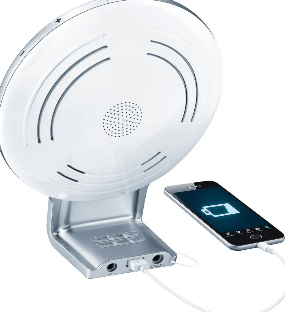 En wakeup light, der både hjælper dig med at vågne frisk og falde lettere i søvn. Vågn til simuleret solopgang og en af de 6 melodier. Fald i søvn til simuleret solnedgang og en af de 4 søvndyssende melodier. Den har Mood Light og 256 forskellige farvenuancer, som let kan indstilles i den gratis app Beurer LightUp. WL 75 har desuden radiofunktion med hukommelse til 10 kanaler. Du kan også tilslutte din smartphone og lytte til din egen musik, via det medfølgende AUX kabel. Den har både alarm- og snoozefunktion på 1-30 min. Den lyser med op til 2000 lux.