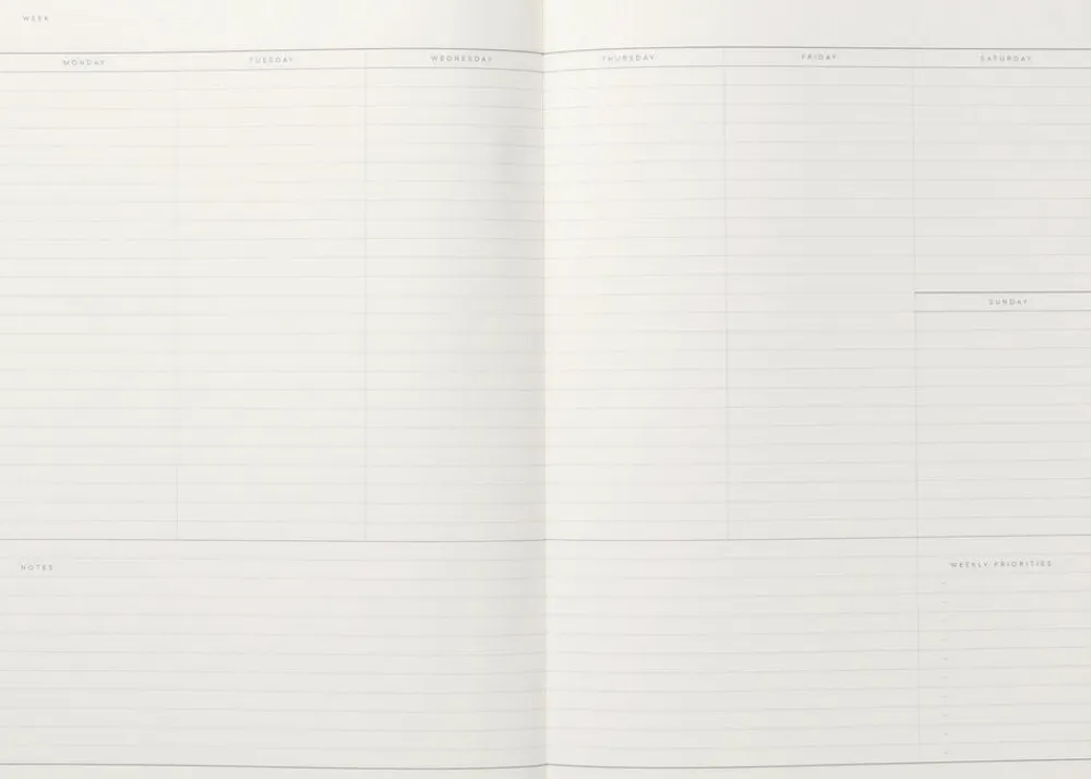 Weeklyplanner fra Notem Studio. Indhold: 56 siders ugeplaner med plads til noter. Farve: mørk grøn. Mål: 170 x 240 mm. Designet i Danmark, produceret i Europa.