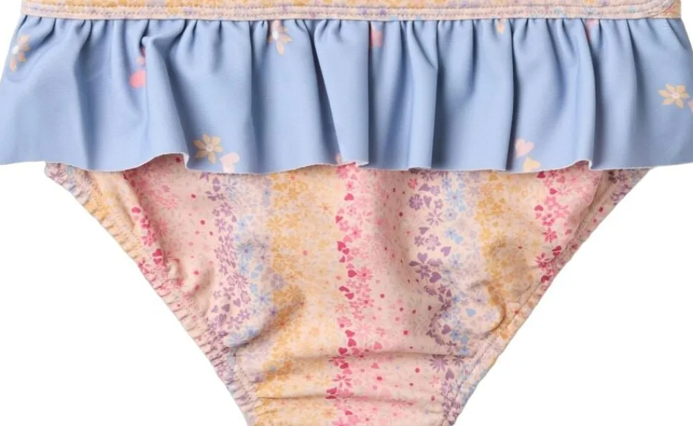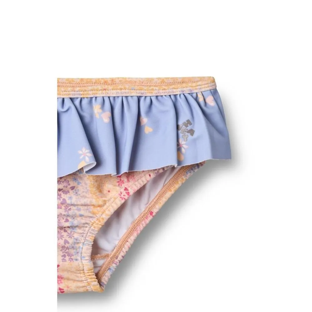 Skøn printet bikini med flæser til børn. – Overdel: Flæsekant foran, samt kryds bagpå med tynde stropper – Underdel: Flæsekant – Håndtegnet signaturprint Denne bikini er perfekt til en varm dag på stranden, ved poolen, vandleg i haven eller i svømmehallen. Bikinien har skønne flæser på både over- og underdel i kontrastfarve. Al badetøj er overvejende produceret i genanvendt polyester, og er Standard 100 fra OEKO-TEX® certificeret. Forlæng dit badetøjs levetid: – Ved altid at skylle dit badetøj efter badning i klor- eller saltvand. – Ved at følge vaskeanvisningerne — – Standard 100 fra OEKO-TEX® – 83% Genanvendt polyester, 17% Elastan – GRS certificeretNydelig bikini med print og volanger for barn. – Tettsittende passform – Bred volang ved utringningen – Strikk i livet med volang – Wheat-signaturprint Wheats badetøy er perfekt for en dag på stranden eller i svømmehallen. Alt vårt badetøy er hovedsakelig laget av resirkulert polyester, og er behagelig for barnet å ha på og lett å bevege seg i. Bikinioverdelen har en bred volang langs halsutringningen. Bikinitrusen har volang i midjen og elastisk linning. Slik tar du vare på badetøyet ditt: – Skyll alltid badetøyet etter bruk i klor- eller saltvann – Følg vaskeanvisningen — – Standard 100 by OEKO-TEX® – 83% Resirkulert polyester, 17% Elastan – GRS-sertifisert