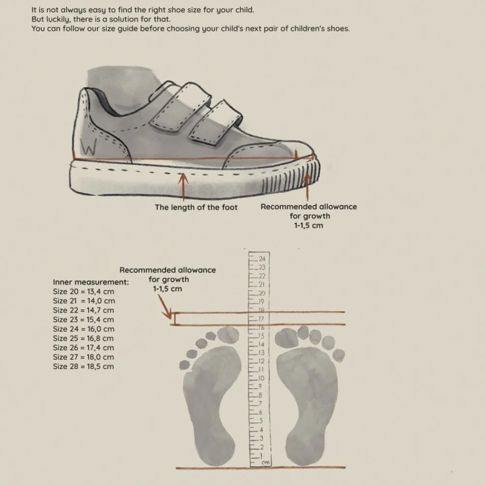 Wheat Fodtøj Fine pre-walkers med dobbelt velcrolukning til det mindste barn. – Uldfoer – Tex membran – Dobbelt velcrolukning Wheats prewalkers er lette, fleksible og behagelige for dit barn at bevæge sig rundt i. De er designet til at beskytte de små fødder, der skal bevæge sig ud på eventyr for første gang. Denne sko har dobbelt velcrolukning i læder, der sørger for at holde tæt om foden. Denne prewalker er perfekt til de kolde måneder, da skoen har uldfoer, som sørger for god varme til de små fødder. Desuden har den Tex membran, der er 100% åndbart og vandtæt. Prewalkeren er lavet i en kombination af LWG certificeret læder samt tekstil. Den udtagelige indlægssål er i blød latex beklædt med uld. Latex er et naturprodukt, der er åndbart og fleksibelt med en trampolineffekt for behagelige skridt. Ydersålen er lavet af gummi, som er et meget let- og skridsikkert materiale. Skoens sål er designet til at dække tæerne omkring snuden for at give den mest optimale beskyttelse. Anbefalet voksetillæg: 10-15 mm Vejl. indvendige mål: Str. 20 = 13,4 cm Str. 21 = 14 cm Str. 22 = 14,7 cm Str. 23 = 15,4 cm Str. 24 = 16 cm Str. 25 = 16,8 cm Str. 26 = 17,4 cm Str. 27 = 18 cm Str. 28 = 18,5 cm — Sammensætning: Yder materiale: LWG certificeret læder samt tekstil Foer: 50% Uld og 50% Bomuld med Tex membran Indersål: Blød latex indlægssål belagt med 100% Uld Yder sål: Gummi