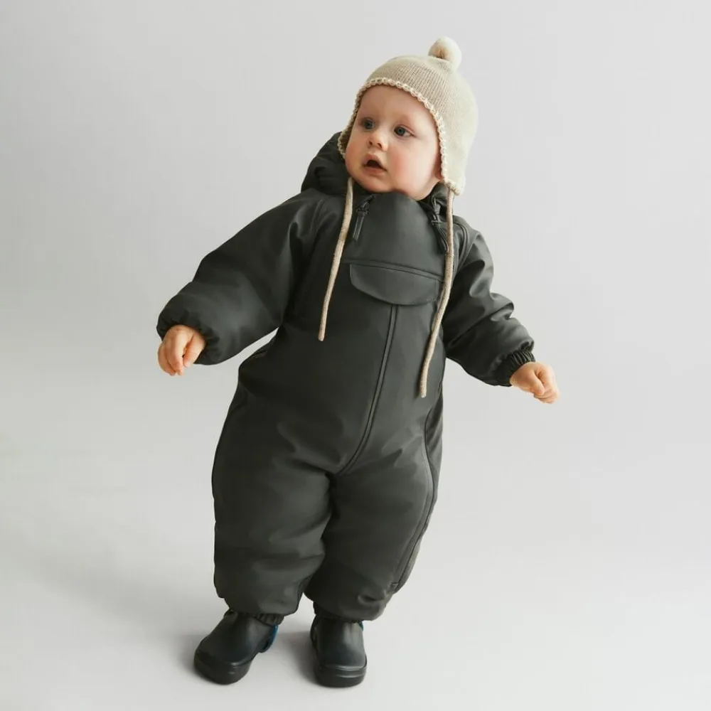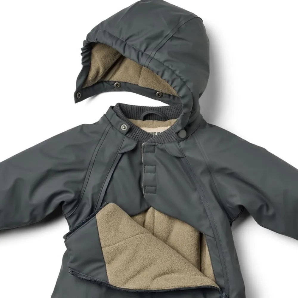 Skøn og uundværlig flyverdragt i vandtæt materiale til din baby. – Normal pasform – Aftagelig og justerbar hætte – Ribkrave – Dobbelt vindstolpe med vandtætte lynlåse – Lomme på brystkassen – Aftagelige gummistropper under fødderne – Elastik i manchetter og i benene, der lukker tæt – Reflekser Wheat’s PU dragter er en perfekt blanding mellem den velkendte regndragt og en flyverdragt. Denne dragt har en tykkere vinter polstring, som gør den varm på selv de koldeste og vådeste vinterdage. Vinterdragten er lavet i åndbart polyurethan (PU) materiale og er derfor unik, da den kan holde dit barn både tørt og varmt på én og samme tid. Dragten har mange praktiske detaljer såsom aftagelig og justerbar hætte, ribkrave og dobbelt vindstolpe. Den ene lynlås kan åbnes fra hagen og hele vejen ned til anklen. Lynlåsen i højre side kan åbnes til midt på brystkassen. Indvendigt er der en lukning over brystet med velcro, som støtter og holder dragten på plads. — Vandsøjletryk: 9. 000 mm Åndbarhed: 600 g/m2/24 t PFC-fri Florin-fri (BIONIC-FINISH® ECO) Vandtætte lynlåse Alle sømme er vandtætte og forseglet — Standard 100 by OEKO-TEX® Yder materiale: 100% Genanvendt polyester i åndbar PU (polyurethan belægning) Isolering: 100% Genanvendt polyester For: 100% Genanvendt polyester