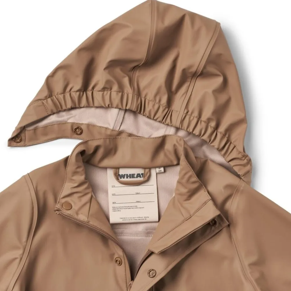 Praktisk regnsæt med matchende jakke og bukser til børn. – Normal pasform – Reflekser – Ensfarvet Jakke: – Aftagelig og justerbar hætte – Påsyede lommer med flaplukning og trykknap – Elastik ved manchetter Buks: – Elastik i taljen på bukserne – Elastik forneden i kanten rundt – Justerbare gummistropper under fødderne Wheats praktiske regntøjssæt med matchende jakke og bukser bør være en fast del af dit barns garderobe. Sættet er lavet i et superblødt og let materiale, der gør det behageligt for dit barn at have på og bevæge sig rundt i. Det er vandtæt og smudsafvisende, og er derfor nemt at rengøre med en våd klud efter en mudret eftermiddag på legepladsen. Regnjakken har aftagelig hætte, elastik ved ærmerne og vandtæt lynlås med hagebeskytter. Bukserne har elastik i benene samt justerbar elastisk i taljen. Kombiner regntøjet med Wheats termotøj indenunder på køligere dage. — – Vandsøjletryk: 8. 000 mm – Vandbaseret PU – Alle sømme er vandtætte og svejset – Vandtæt lynlås – PFC-fri – Fluorfri vand- og smudsafvisende finish (BIONIC FINISH ECO) – GRS-certificeret — – Standard 100 by OEKO-TEX® – 55% Post Consumer polyester, 45% Vandbaseret Polyurethan coating