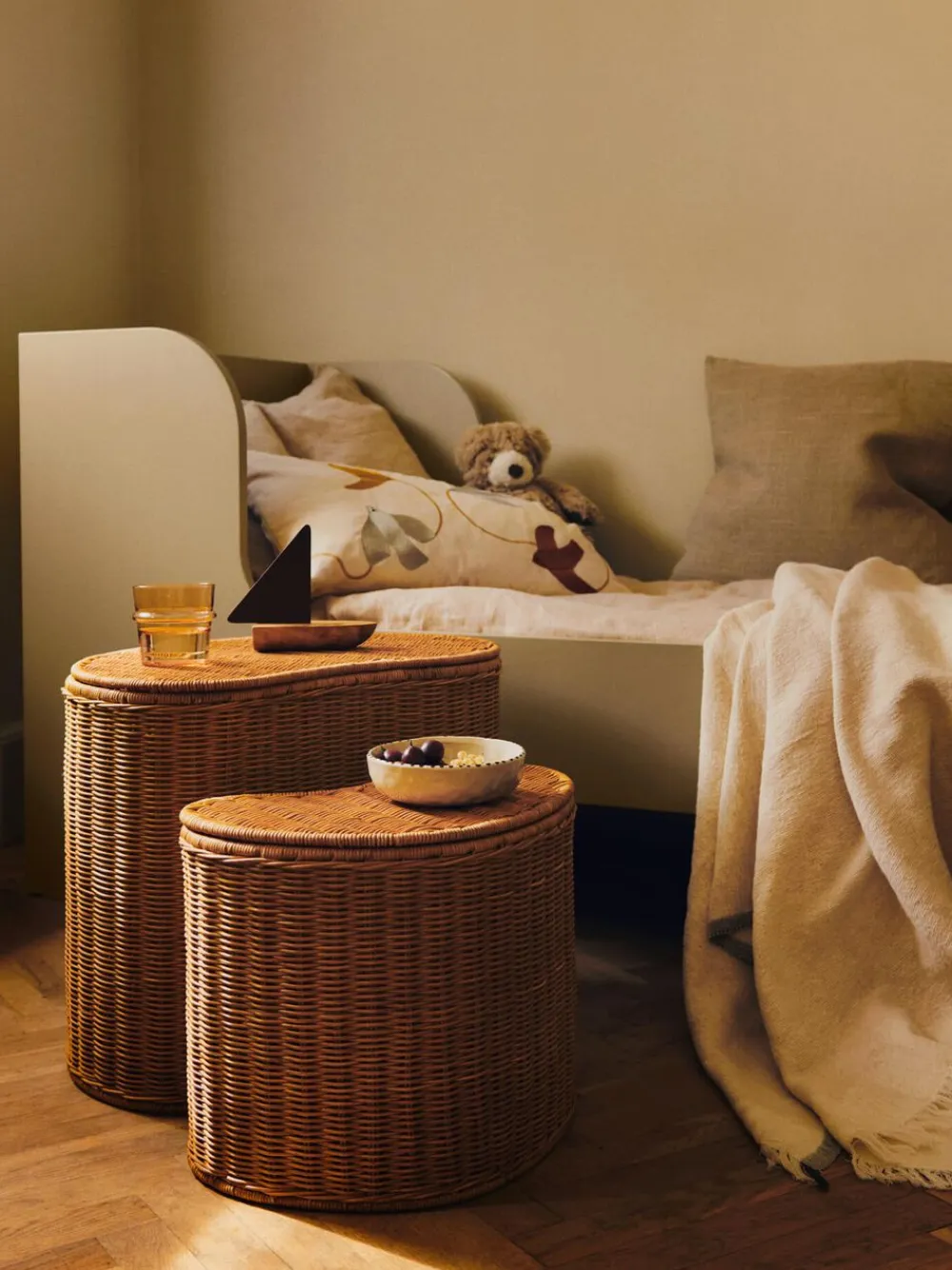 Willora Flettet opbevaring giver varme og legende karakter til børneværelset. De to organisk formede bokse er fremstillet af håndflettet rattan og har en jernforstærket ramme. Den mindste boks kan sættes ind i den største, når de ikke er i brug. De er ideelle til opbevaring af legetøj, bøger eller hobbyartikler og kan også bruges som dekorative sideborde i legeværelset eller soveværelset.