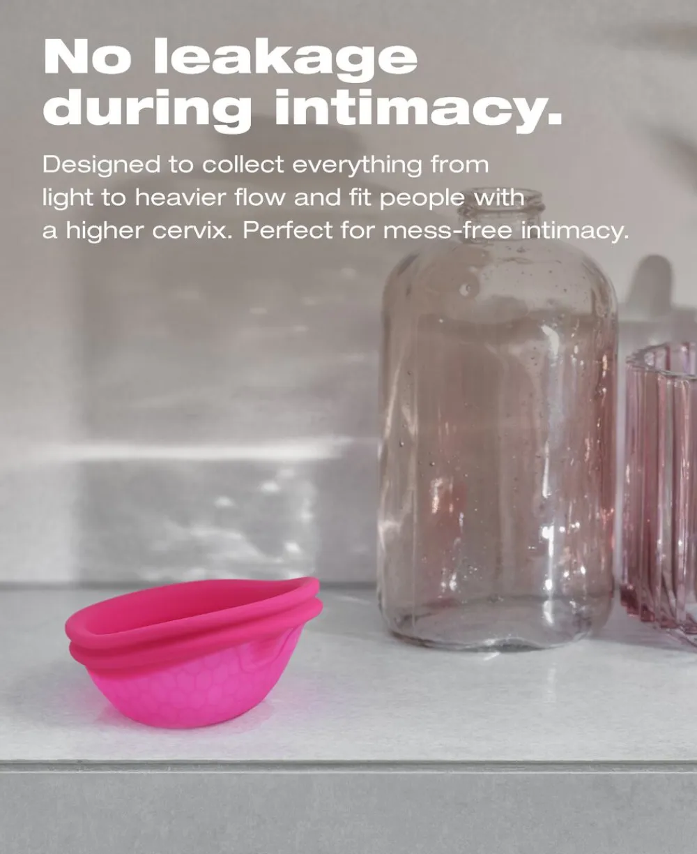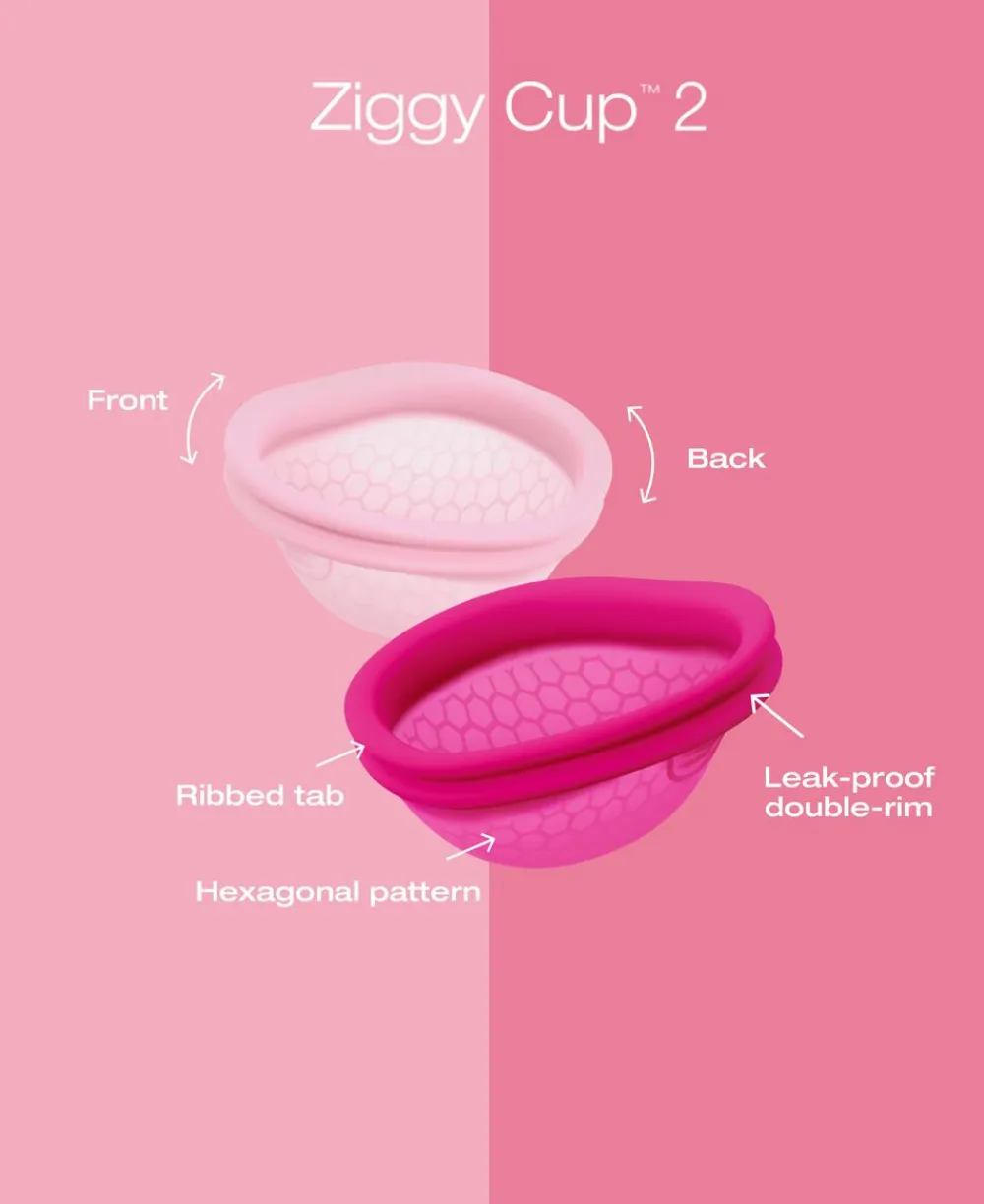 Ziggy Cup 2 er udelukkende fremstillet af 100 % medicinsk silikone, hvilket gør den fuldstændig kropssikker. Det er en miljøvenlig støtte under menstruation, som du kan bruge igen og igen i op til to år. Denne kop giver op til 8 timers non-stop menstruationsbeskyttelse. På grund af den måde, den hviler på under livmoderhalsen, opsamler den al blod, så du også kan nyde sex uden lækage eller besvær – lige når du vil.