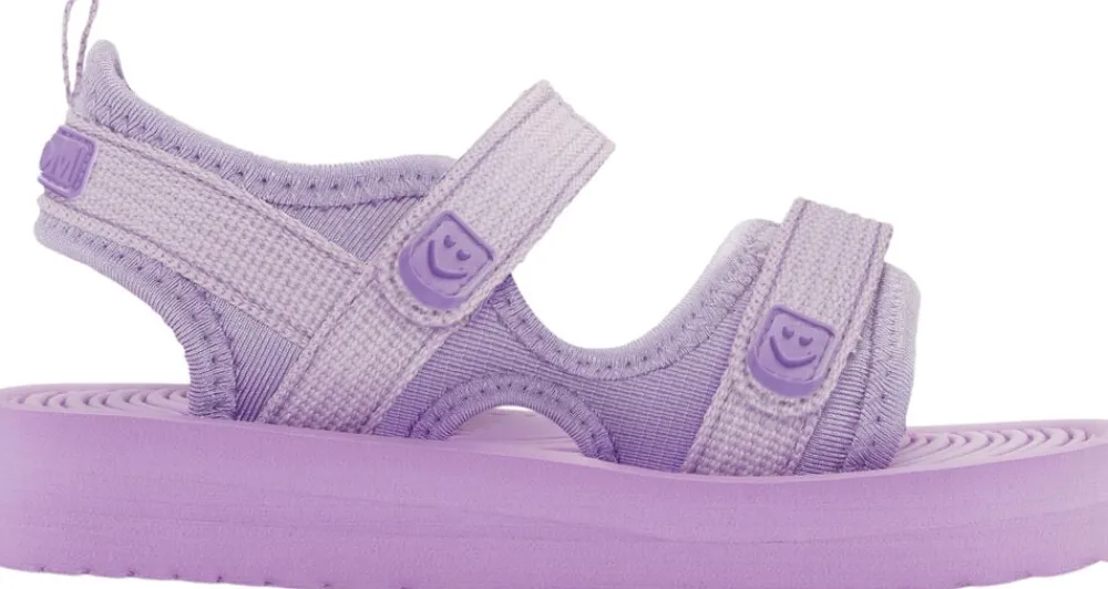 Lette og sporty lilla sandaler med en blød skumsål. Sandalerne er udstyret med komfortable neoprenpaneler, der sikrer foden, samt praktiske velcrolukninger ved anklen og over forfoden, hvilket gør dem nemme at tage af og på.