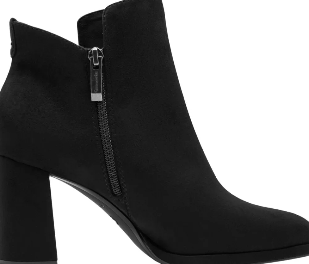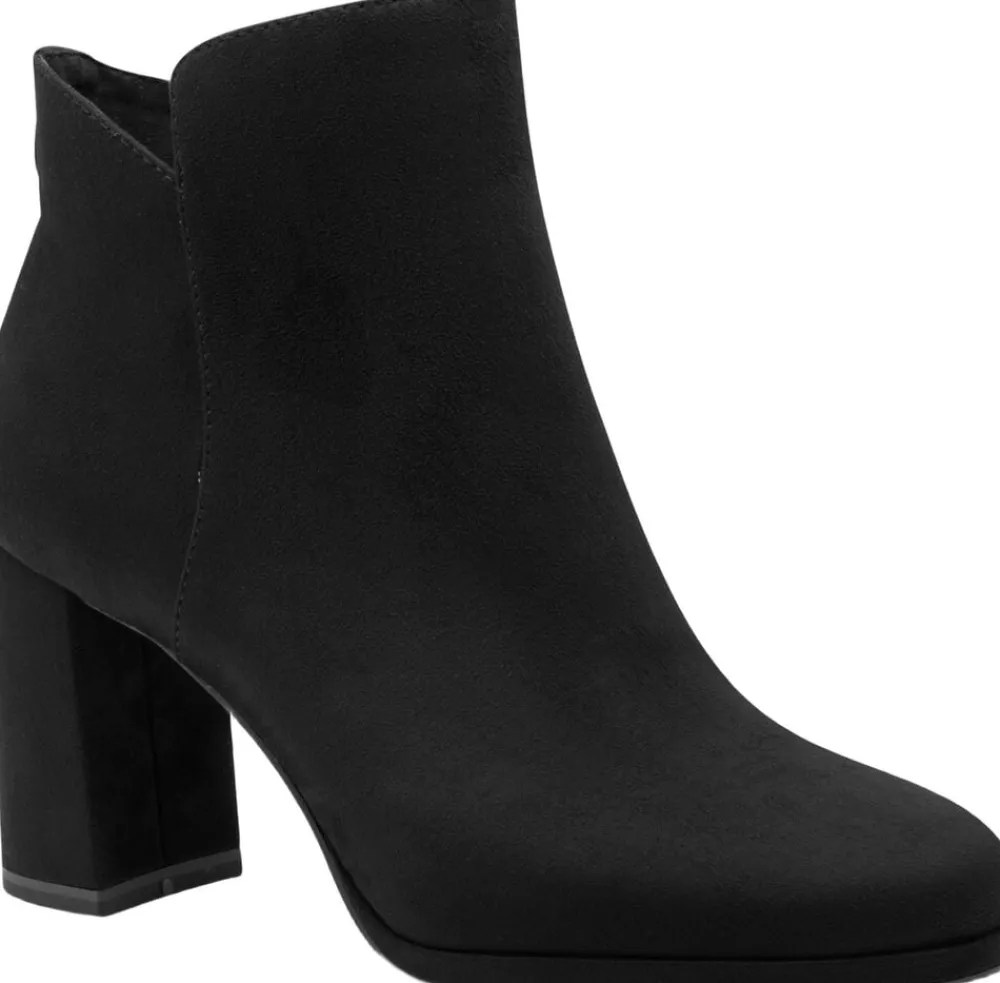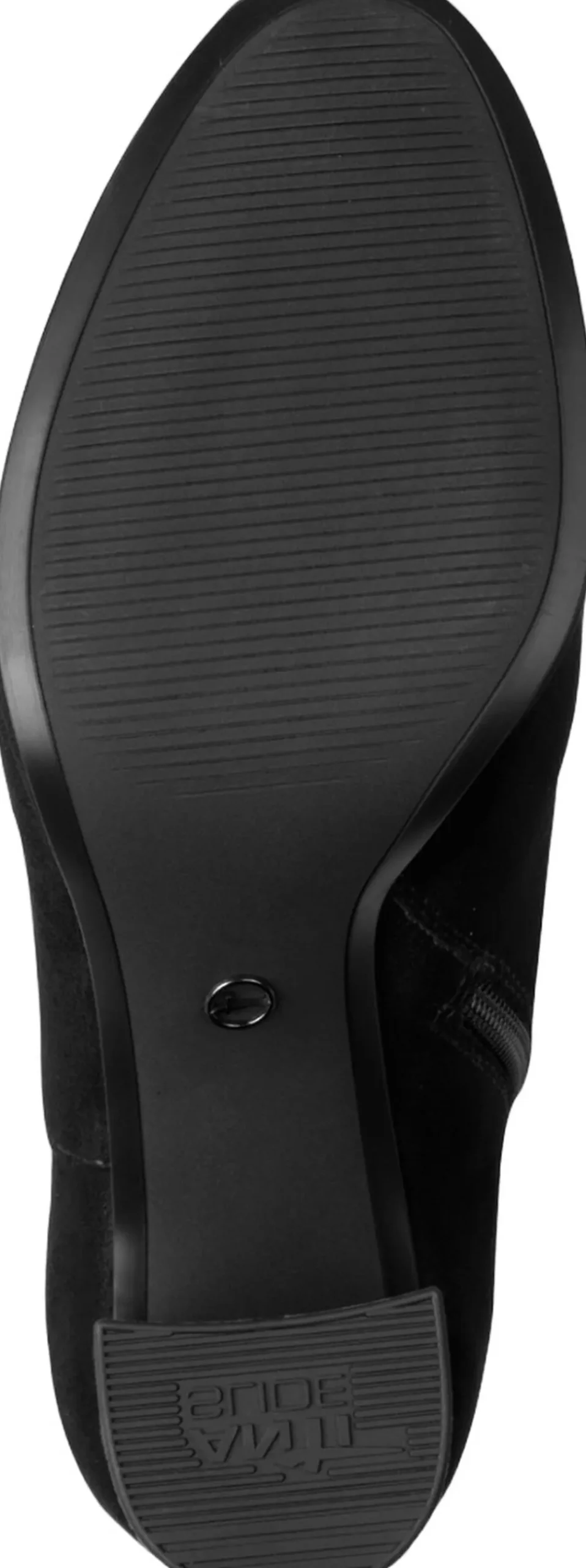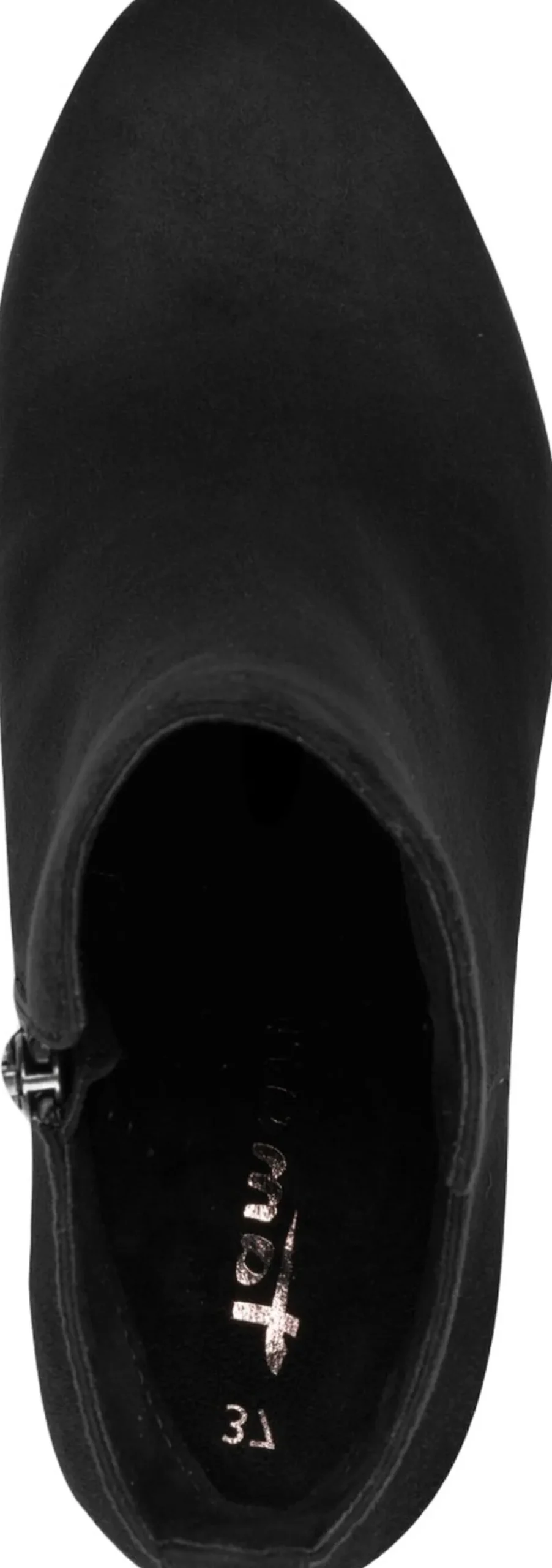 Kort let støvle i sort tekstil materiale. Blokhæl på 80mm skafthøjde på 10 cm. Indvendig lynlås og der er antislide og antichok i hælen samt Touch it effekt i dæksålen