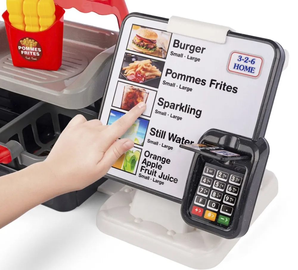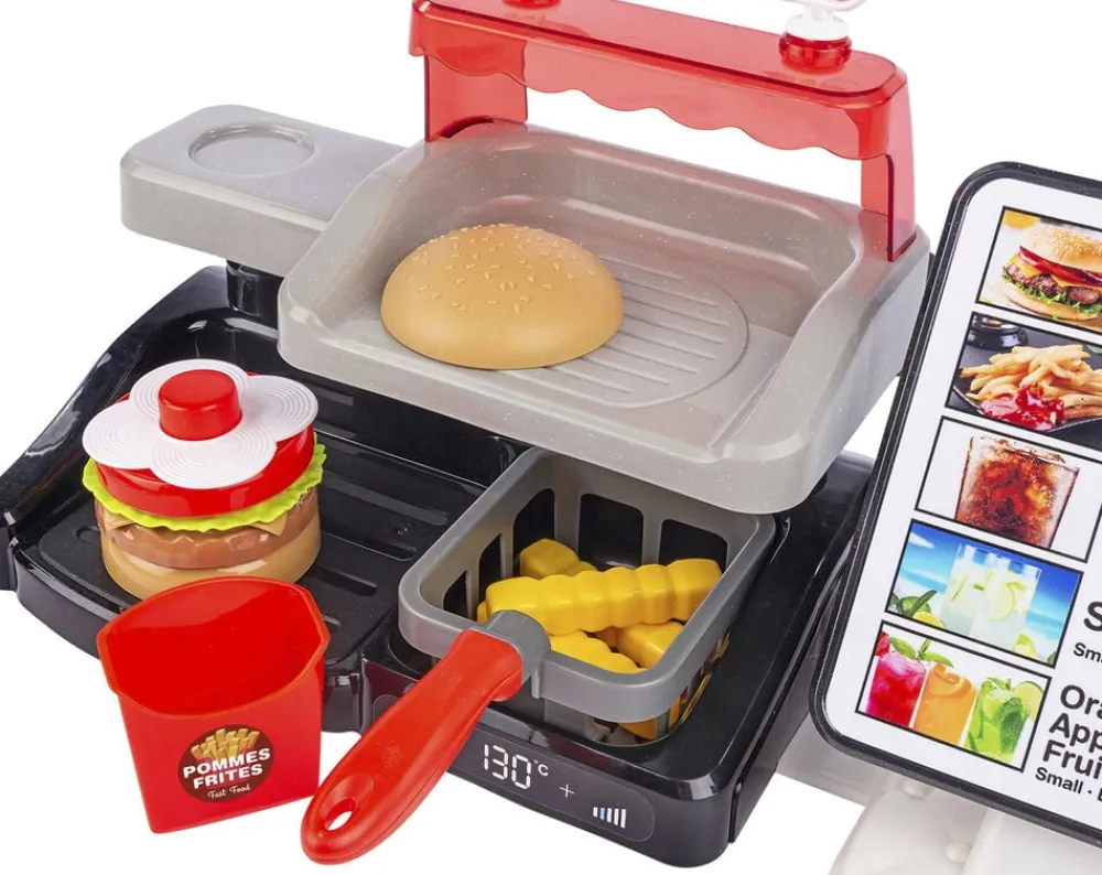 Burgerbar med lyde og tilbehør Med touchskærm og kortlæser med lyde, kreditkort, pommes frites sektion med friturekar. paletkniv, pommes frites, saml-selv burger og 2 drikkekopper med låg Inkl 2 stk AAA-batterier