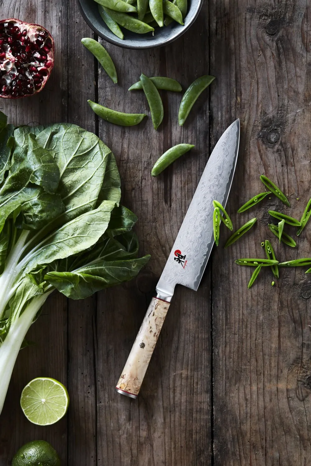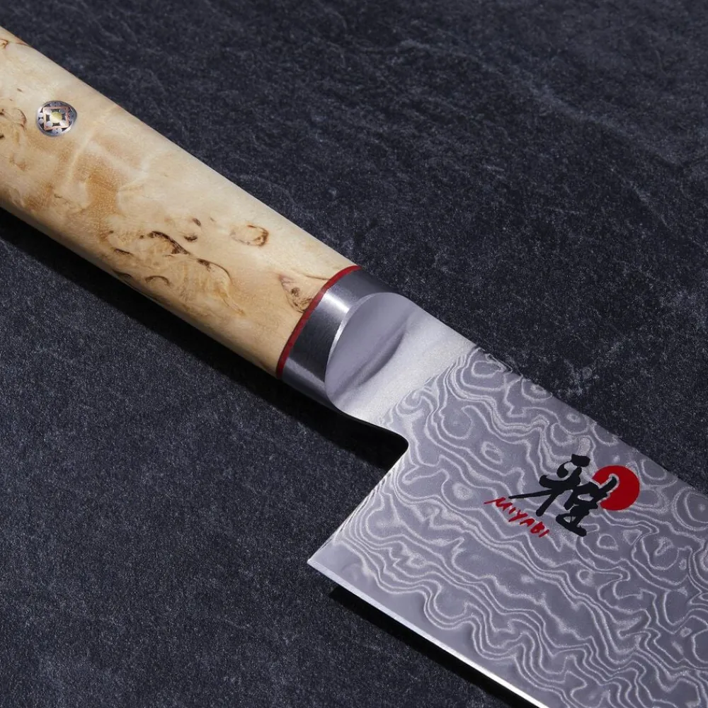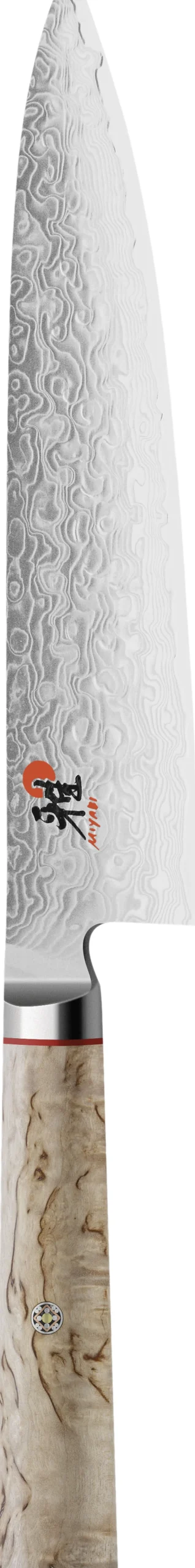200 mm Gyutoh fra MIYABI 5000MCD er et yderst imponerende skæreredskab grundet knivens tynde, dog stabile blad med autentisk japansk profil. Knivens D skaft er lavet i masurtæ. Stålet har en Rockwell på ca. 63.