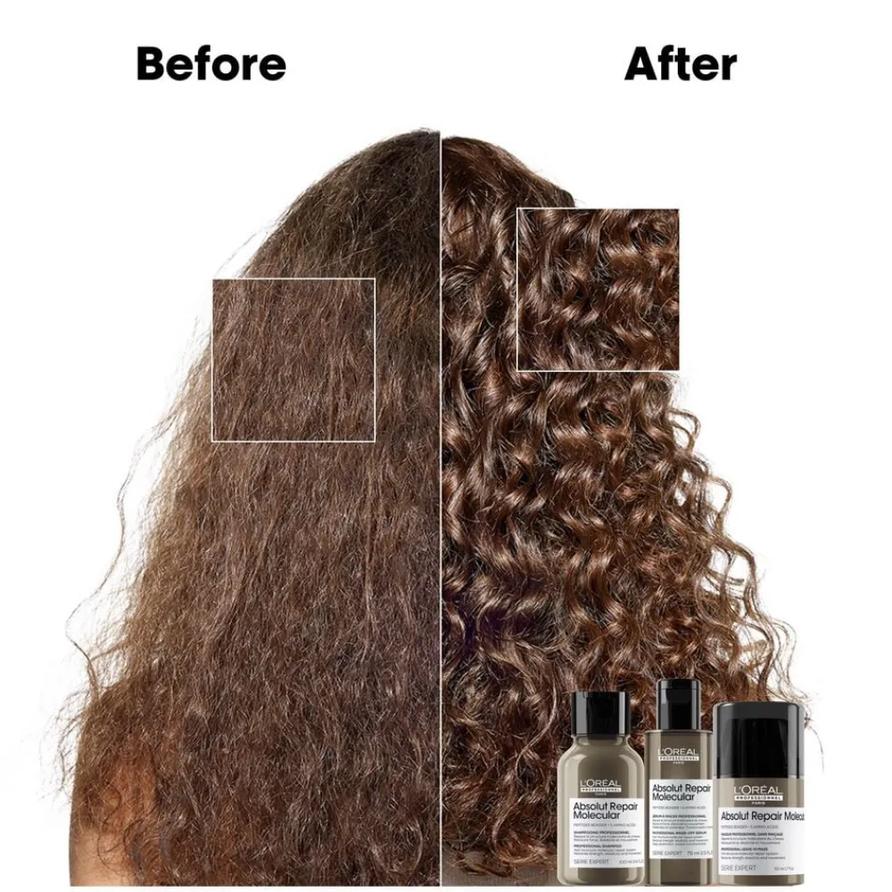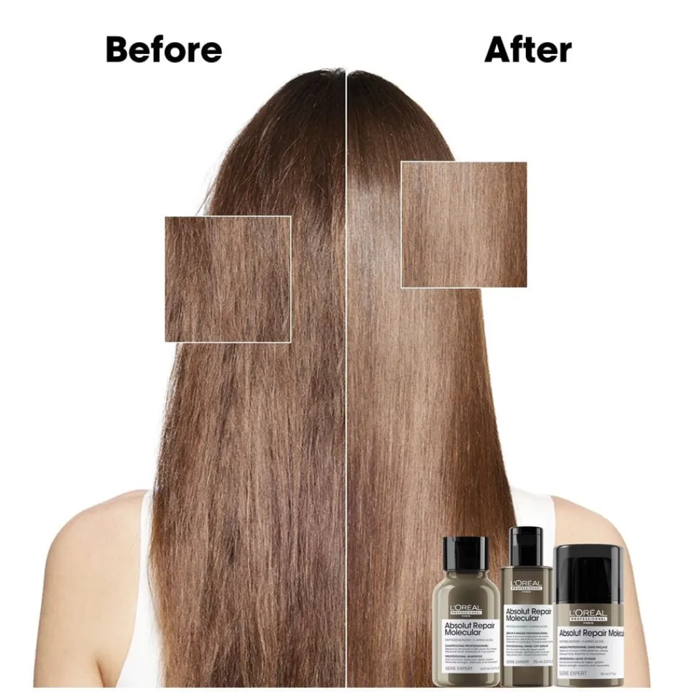 Dette sæt indeholder ministørrelser: Absolut Repair Molecular Shampoo 100 ml, Absolut Repair Molecular Rinse-Off Serum 75 ml & Absolut Repair Molecular Leave-in Maske 50 ml.
