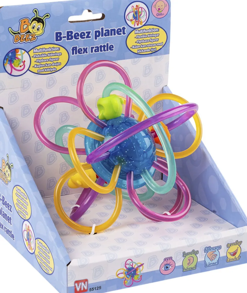Flex rangle med bideringe Kuglen kan drejes med kliklyde og de bløde fleksible bideringe og flytbare figurer er lindrende for babyens ømme gummer