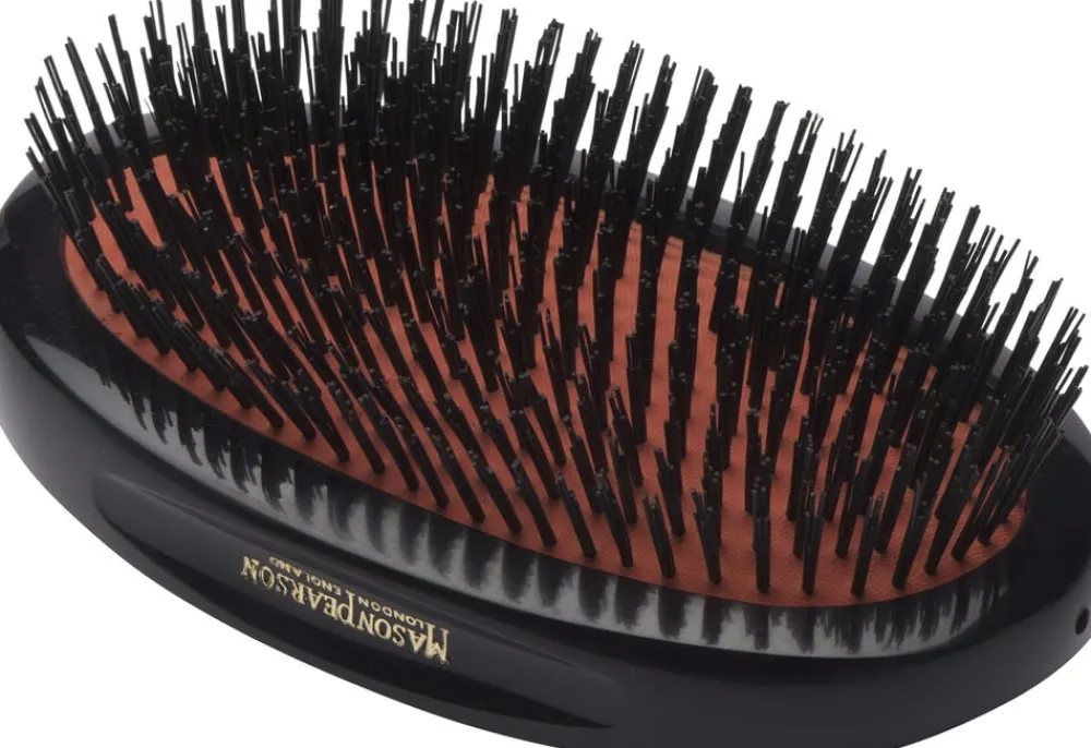Mason Pearson B2M er en medium størrelse herrebørste i sortimentet og er lavet udelukkende af rene vildsvinehår.Mason Pearson børsten i ren vildsvinehår anbefales til fint hår. B2M er specifikt designet som en herrebørste, Military style betyder at børsten ikke har et håndtag og er genereltkraftigere og mere maskulin i sit udtryk. En Mason Pearson børste masserer og stimulerer hovedbunden, hvorved hårbundens naturlige olier bliver frigivet. Ved gennembørstning bliver olien fordelt ud i længden af håret, så håret får en naturlig glans, samt fylde i bunden. Mason Pearson anbefaler 100 strøg om dagen – en investering i et godt hår hele livet!