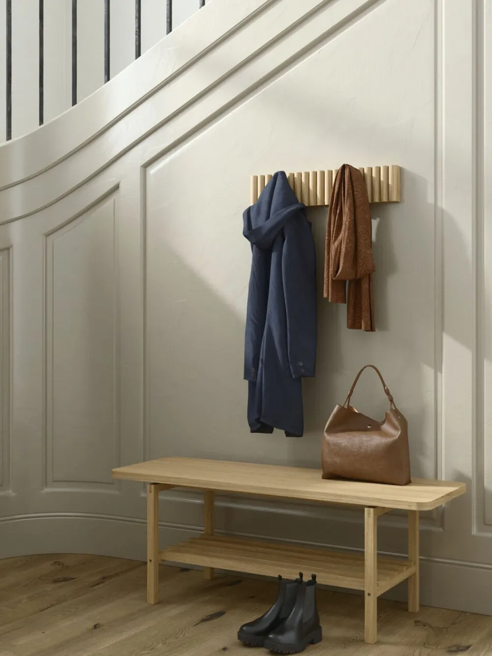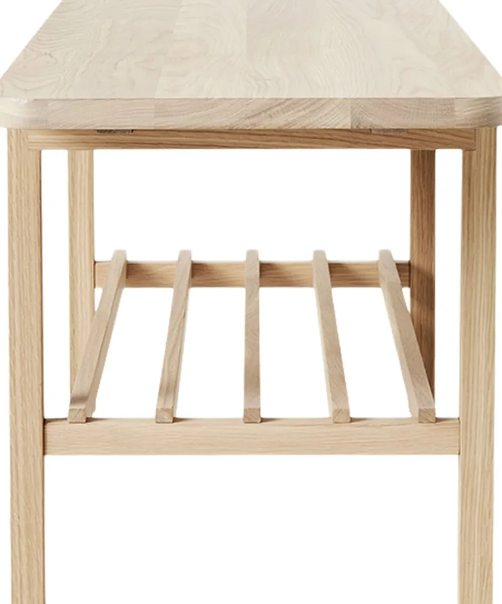 Says Who har gennem det enkle design skabt en bænk, der passer i mange rum i hjemmet og kan bruges i både entre, soveværelse og som ekstra pladser ved spisebordet. Den ekstra opbevaringshylde under kan både bruges til sko i entreen eller til opbevaringskurve for at skabe ro i indretningen.