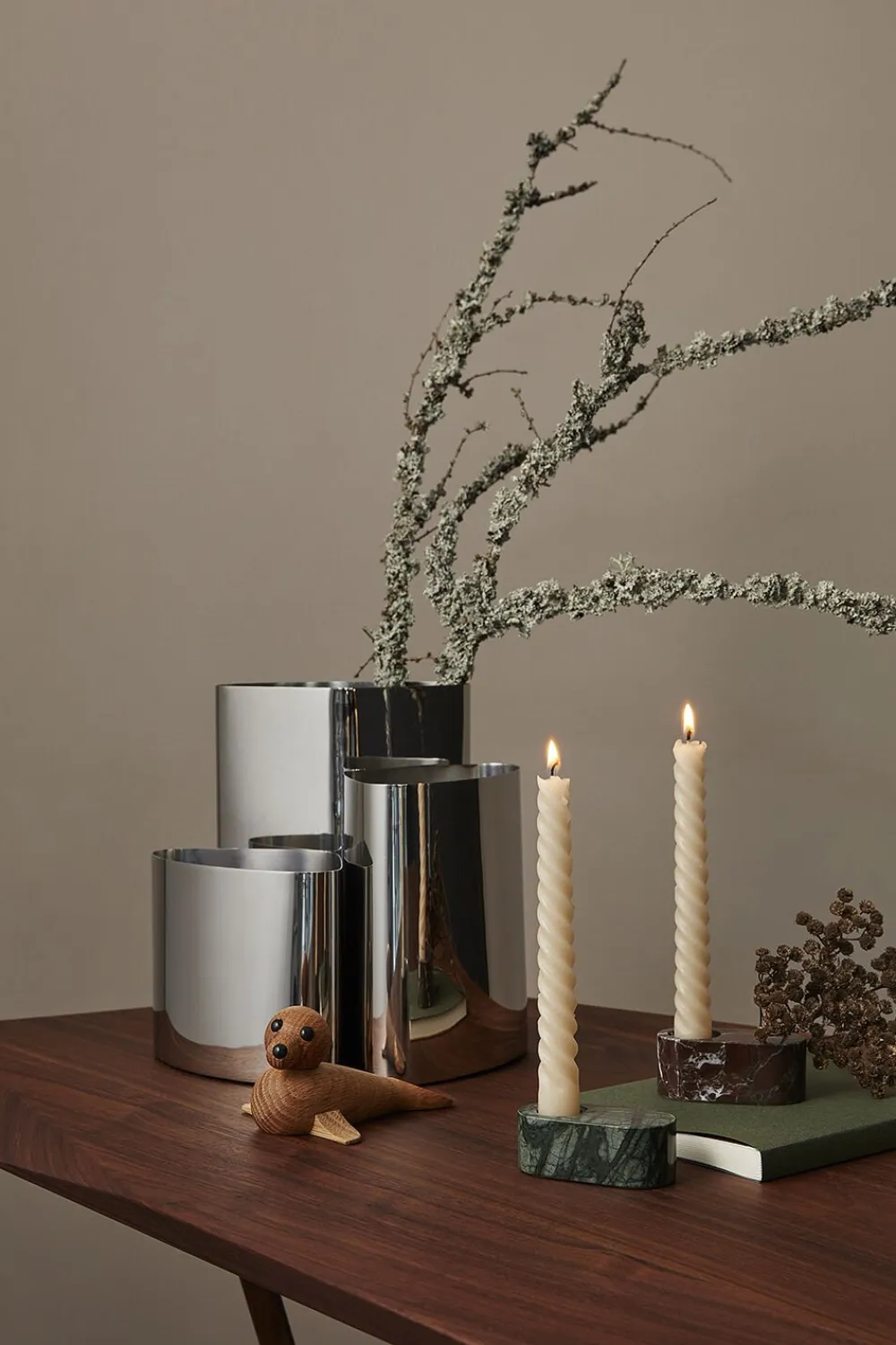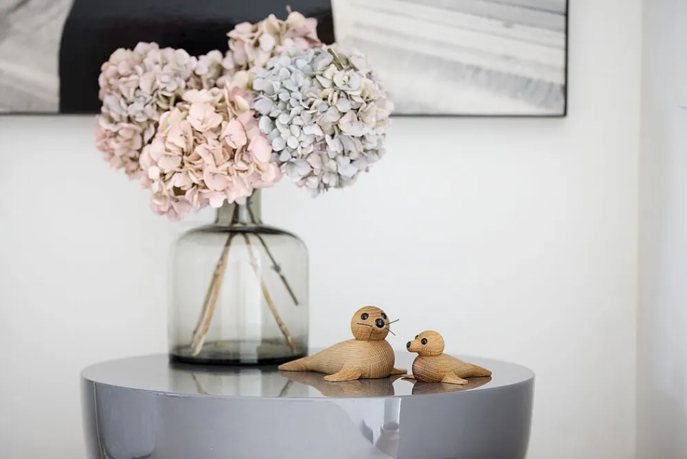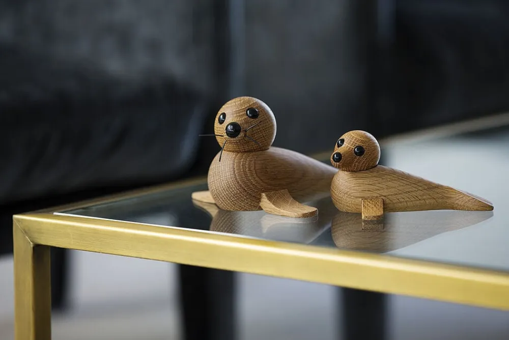 Babysæl er den mindste af Chresten Sommers sæler. Den er oplagt til at stå i vindueskarmen – eventuelt sammen med Hunsæl – og tilfører din stue eller dit køkken nordisk præg, naturliv og en bid af dansk designtradition. Det helt særlige ved Babysæl er, at hovedet kan drejes i alle retninger. Dermed får figuren liv, og du kan løbende skifte udtrykket. Det giver variation i dit udtryk. Står Babysæl sammen med Hunsæl, giver det uanede muligheder for interaktion mellem de to sæler. Babysæl appellerer til både børn og voksne – og imiterer på fornem vis dyreliv på den nordlige halvkugle. Sæt de to sæler sammen på reolen og giv dit hjem et touch af nordic living. De to sæler er Chresten Sommers første figurer for Spring Copenhagen. Han er uddannet bådebygger, men viser med sine sæler et særligt blik for trædesign, der bringer liv og naturlig dynamik ind i hjemmet. De to sæler er fine eksempler på brugen af dyr i den nordiske designtradition, hvor mange danske designere har ladet sig inspirere af den nordlige halvkugles dyreliv. Når sælerne ligger enkeltvis eller side om side i vindueskarmen, er det næsten som at se ægte sæler i naturen. Hunsæl og Babysæl er fine eksempler på træhåndværk, der rammer plet med proportioner og udtryk. Det er imitation af nordisk dyreliv, når det er allerbedst. Og det er håndlavet dansk design i høj kvalitet.