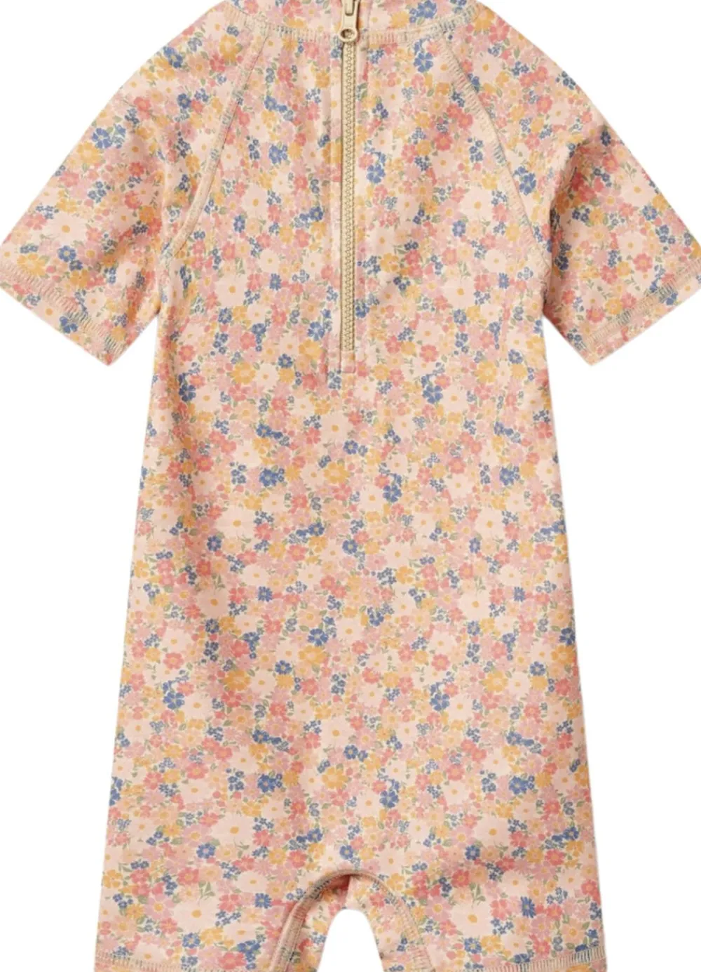 Praktisk badeheldragt med korte ærmer og ben til din baby. – Tæt pasform – Lille krave – Lynlås ned bagpå – Raglanærmer – Unisex – Wheat signaturprint Wheats badetøj er perfekt til en dag på stranden, ved poolen eller blot til vandleg i haven. Alt vores badetøj er overvejende produceret i genanvendt polyester, og er yderst behageligt for dit barn at have tæt på kroppen. Badeheldragten har en lille krave til at beskytte hals og nakke, samt raglanærmer, så dit barn ikke bliver udsat for sol på de sarte områder af kroppen. Desuden har den en lynlås bagpå, så det er nemmere for dig at iklæde dit barn. Stylen er med UV 40+/UVF 40+ beskyttelse og er Standard 100 fra OEKO-TEX® certificeret. Forlæng dit badetøjs levetid: – Ved altid at skylle dit badetøj efter badning i klor- eller saltvand. – Ved at følge vaskeanvisningerne — – Standard 100 af OEKO-TEX® – 83% Genanvendt polyester, 17% Elastan – GRS certificeret