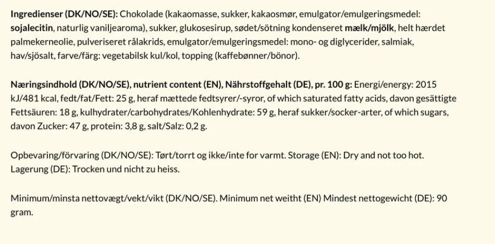 Guld symfoni. 2 stk. stænger. Håndlavet dansk kvalitet. Den originale Salt Bagsværd Lakrids udskæres, og overtrækkes med Dulce Karamelliseret hvid chokolade. Lakridsen har sin karakteristiske smag, fordi den fremstilles af det fineste lakridspulver, og fordi den frembringes af Maillard-reaktionen, hvor mælkeprotein og sukker reagerer med hinanden i gryden. Efter kogning hældes lakridsen i forme, hvor den størkner natten over. Herefter udskæres den og føres gennem et slør (eller gardin) af flydende chokolade. Efter tørring er den klar til at blive spist.