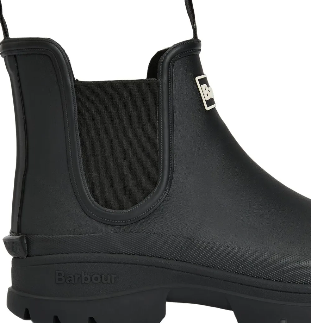Gummistøvle fra Barbour i en lækker kvalitet. Gummistøvlen er kort i modellen med en let afrundet snude, logodetalje, elastik i siderne samt en grov, præget sål. En lækker gummistøvle af den bedste kvalitet.