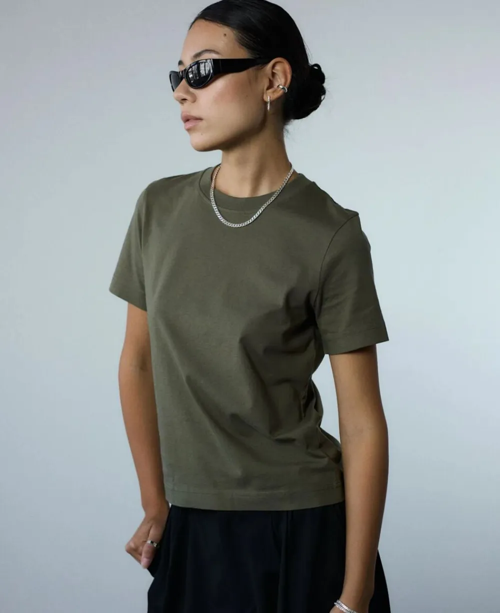 T-shirten har korte ærmer, rund hals og en klassisk pasform. Modellen kommer i et regular fit, som kan justeres efter ønske: vælg en størrelse mindre for et mere tætsiddende look eller en størrelse større for et løsere fit. T-shirten er fremstillet af 100% økologisk bomuld og er pre-washed, hvilket betyder minimal krympning ved korrekt vask.